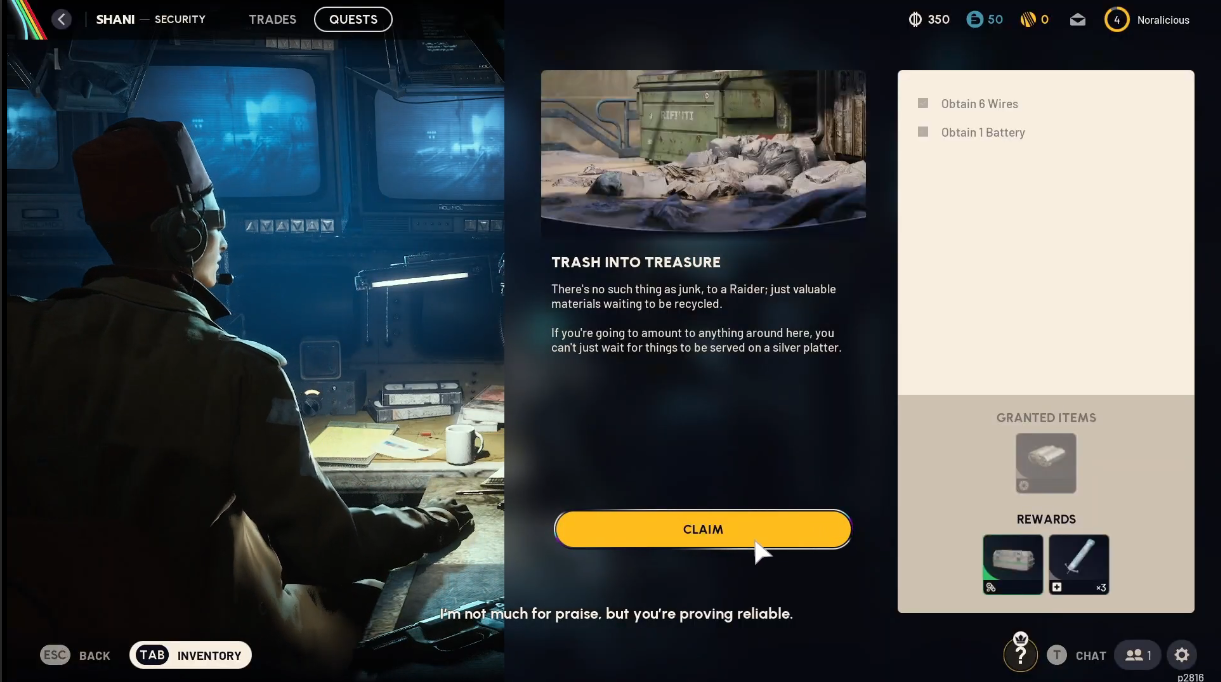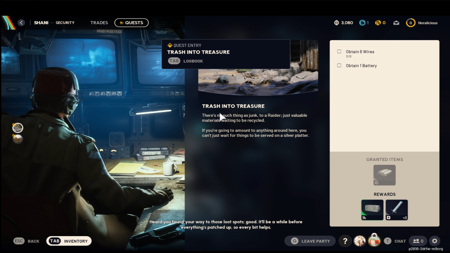The Trash Into Treasure quest is given by Shani, located in the Security division. This quest introduces material scavenging—collecting essential components to support the Raider outpost.