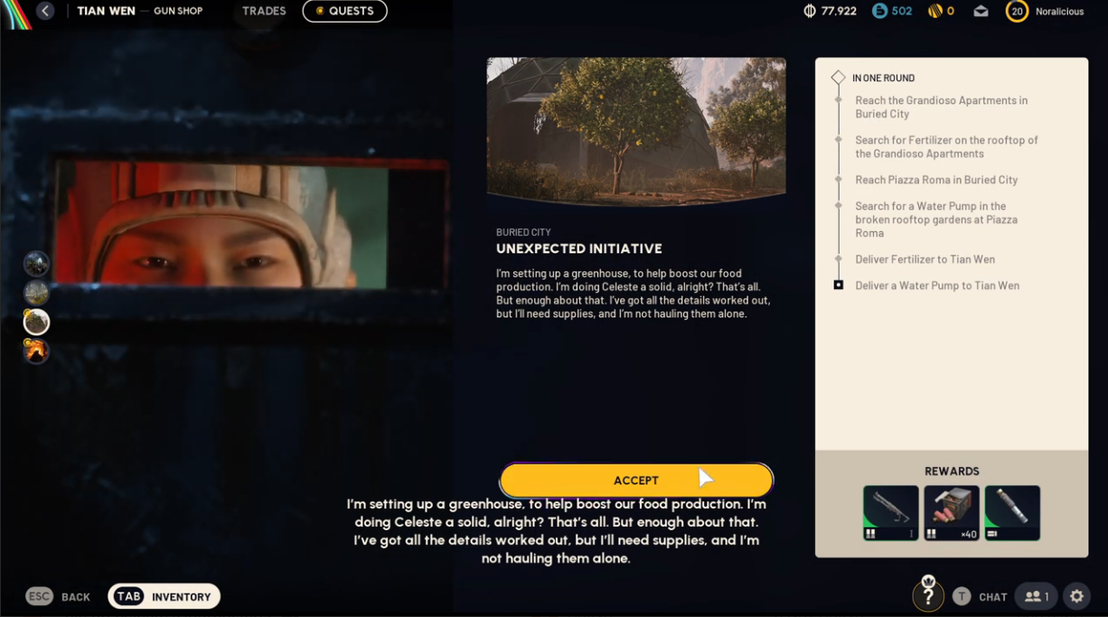 The Unexpected Initiative quest in ARC Raiders is given by Tian Wen, the gun shop vendor in Speranza. She’s setting up a greenhouse to boost food production and needs your help collecting supplies in the Buried City. This mission involves exploration, climbing, and resource gathering across rooftop areas.