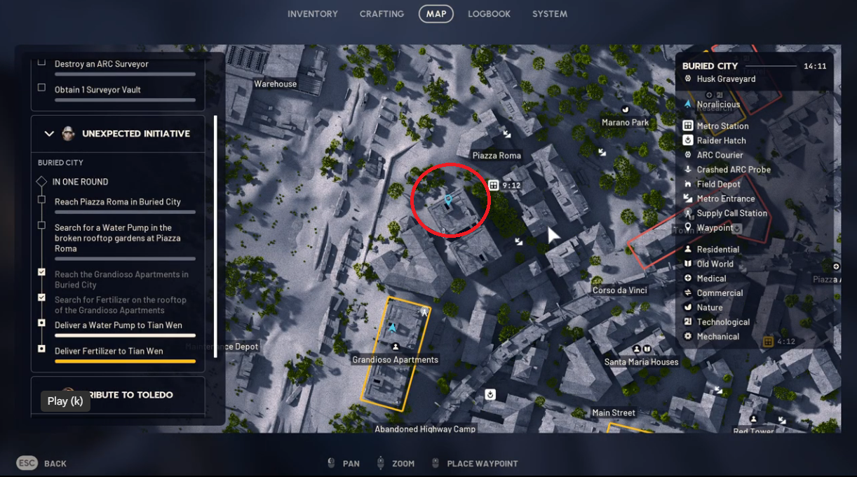 - Search for a Water Pump in the broken rooftop gardens at Piazza Roma