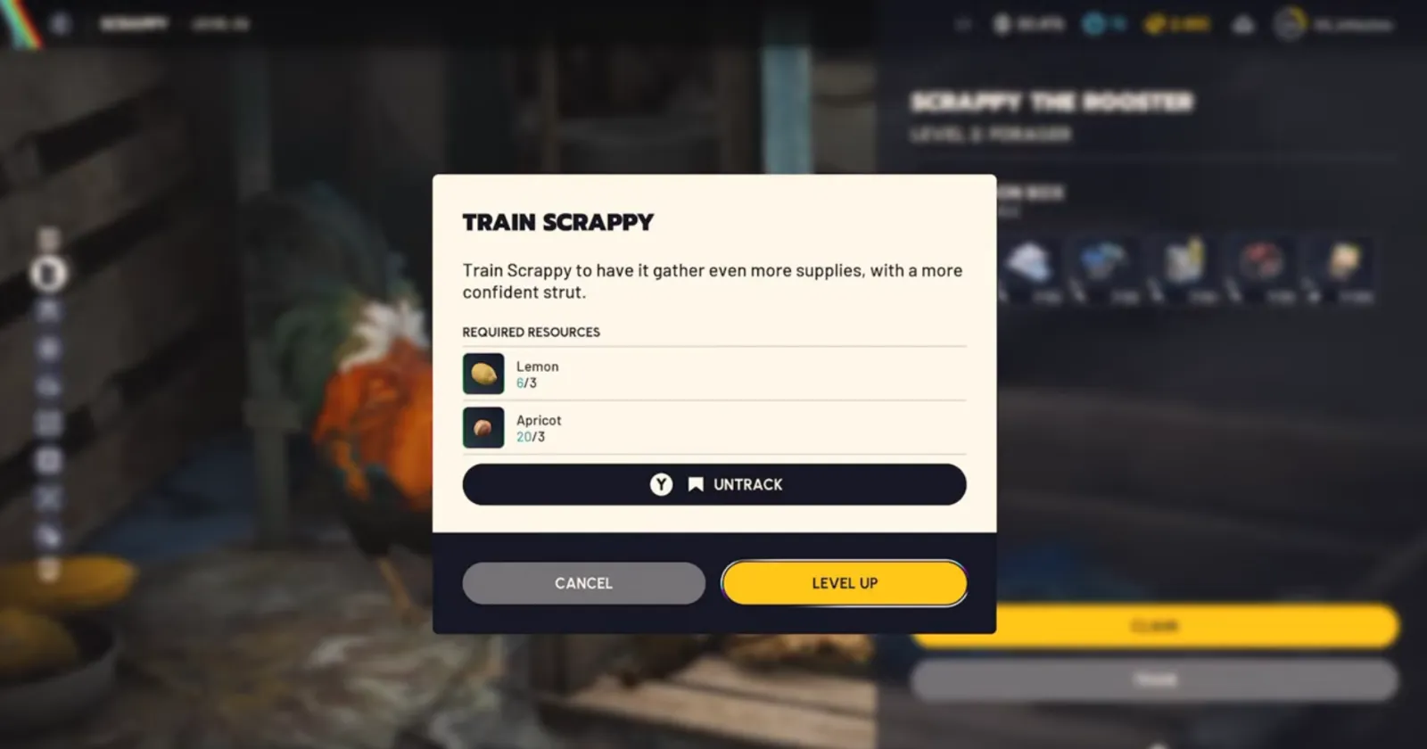 To upgrade Scrappy, access the Workshop, choose the Scrappy tab, and select “Train.” If you have the required resources, simply click "Level Up".