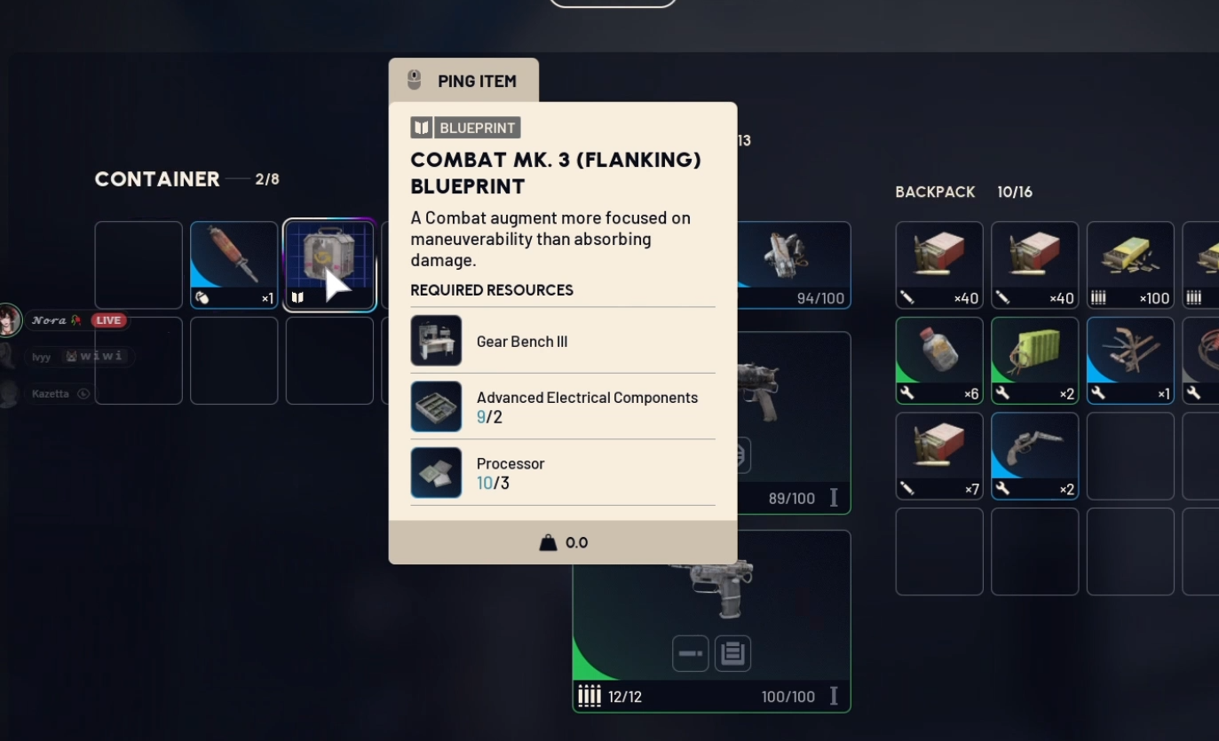Once the blueprint is acquired, move it from the Stash to the Inventory. Then right-click on it and select "Learn and Consume". Make sure your Gear Bench is upgraded to level 3. Gather the Advanced Electrical Components and Processors. Finally, craft the Combat Mk.3 (Flanking).