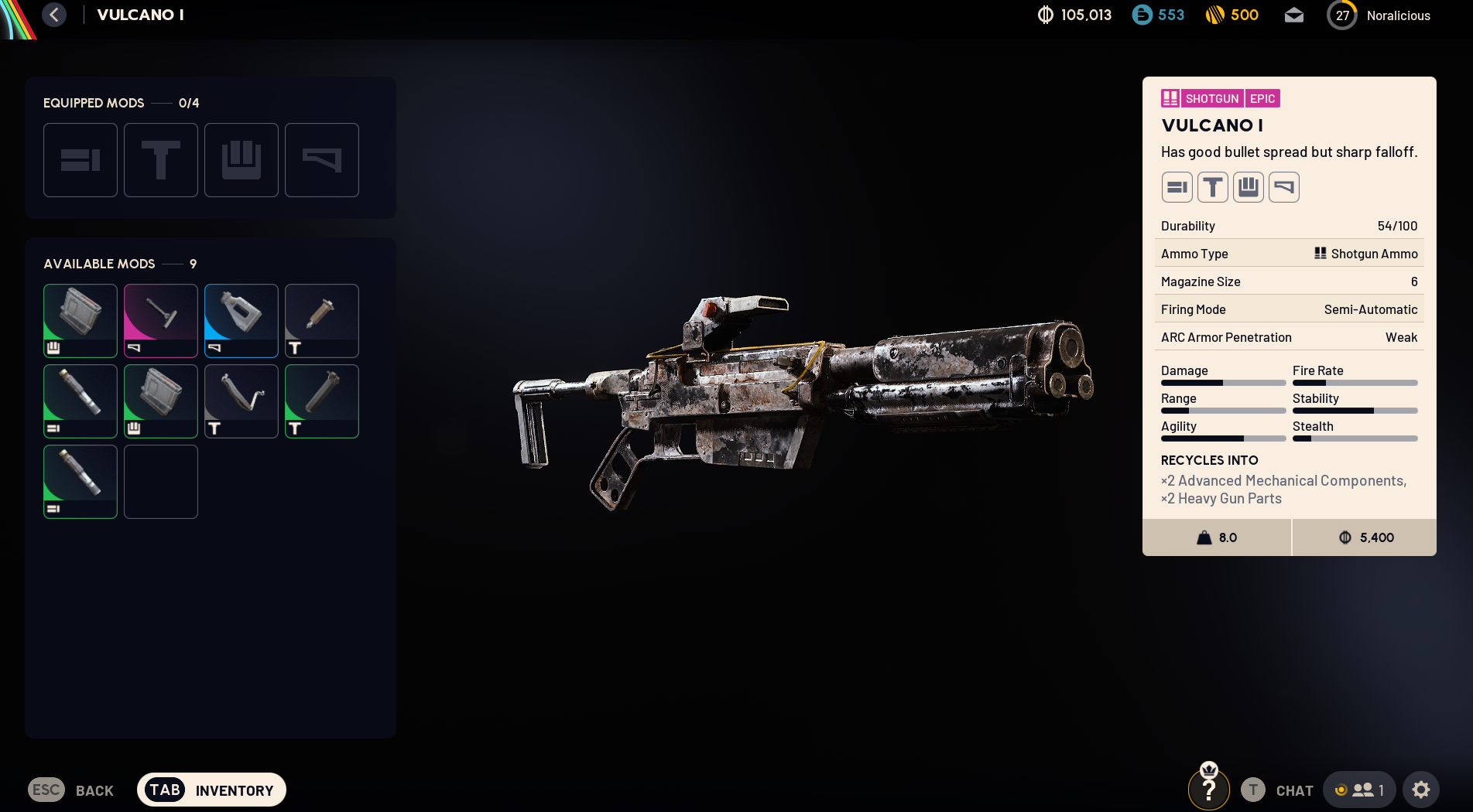 - The Vulcano shotgun has wide pellet spread and strong close-range damage, but damage drops sharply over distance.