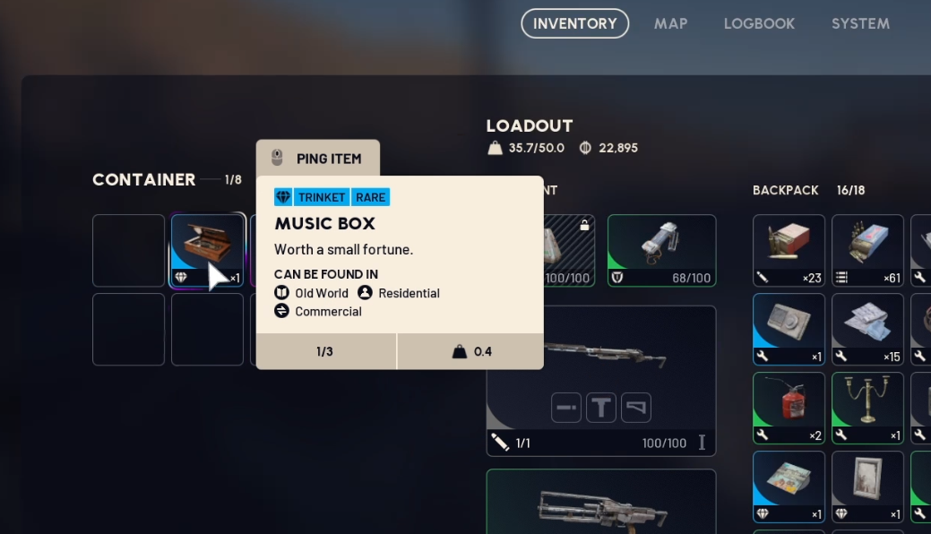 Trinket items, marked with a diamond icon on their thumbnail and labeled as "Trinkets," serve an entirely different purpose. These aesthetic collectibles cannot be recycled at all; they exist solely for selling to traders for coins. The Music Box is a good example of a trinket.