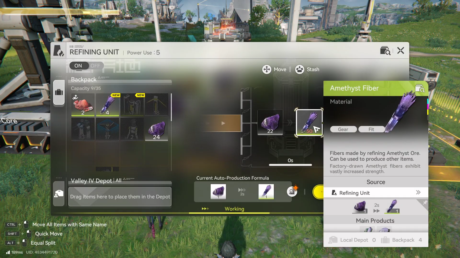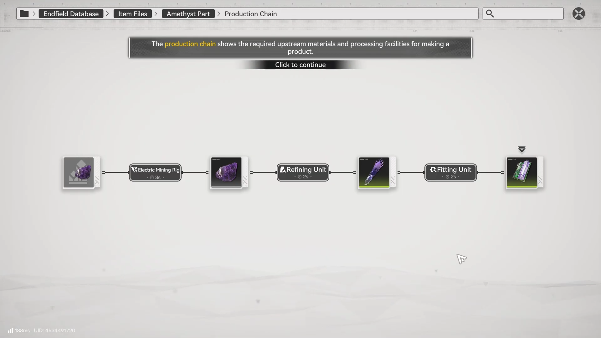 | Main processing chain | Amethyst Ore → Amethyst Fiber (Refining Unit) → Amethyst Parts (Fitting Unit) |