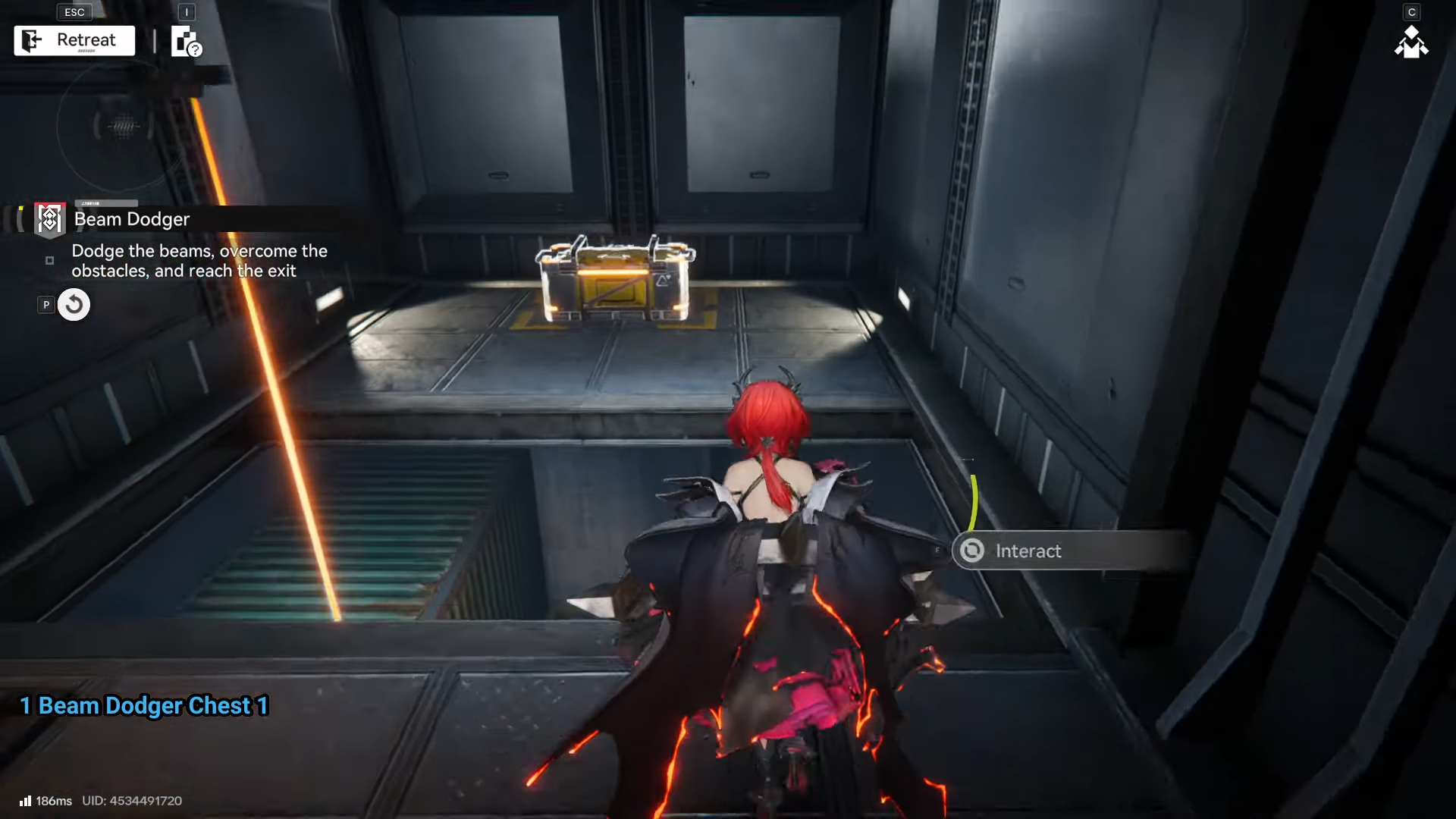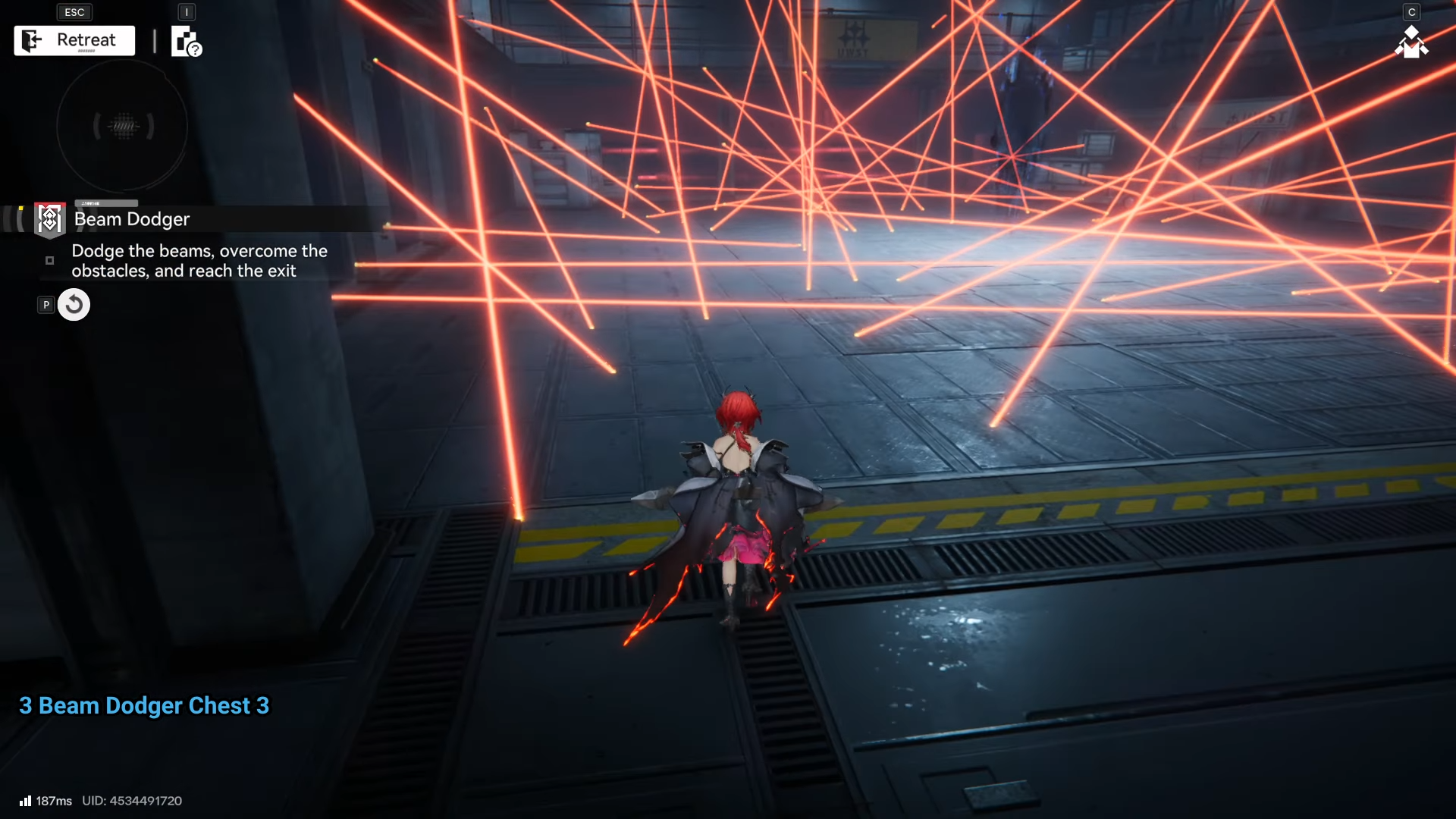 Move forward along the path until two pairs of lasers block ahead. Time your pass—the farther pair pulses on and off.