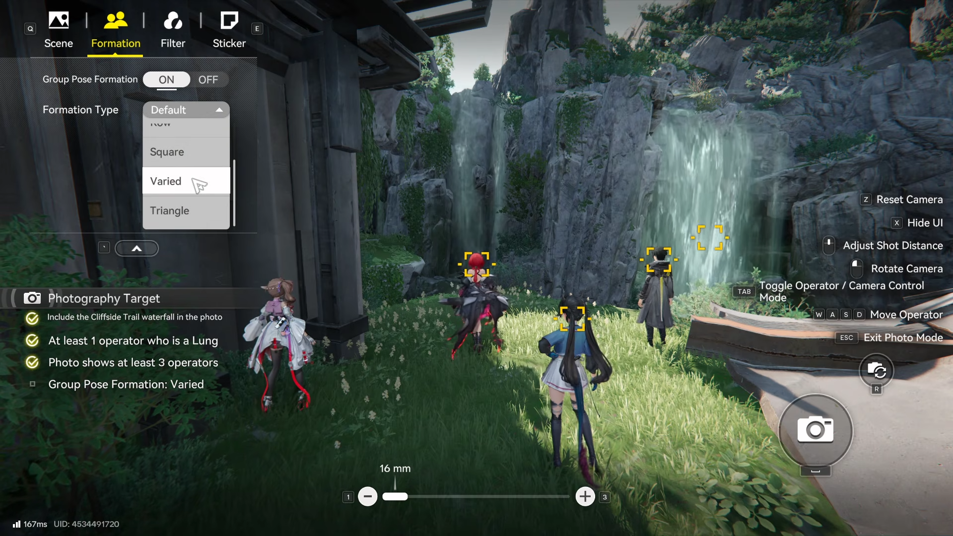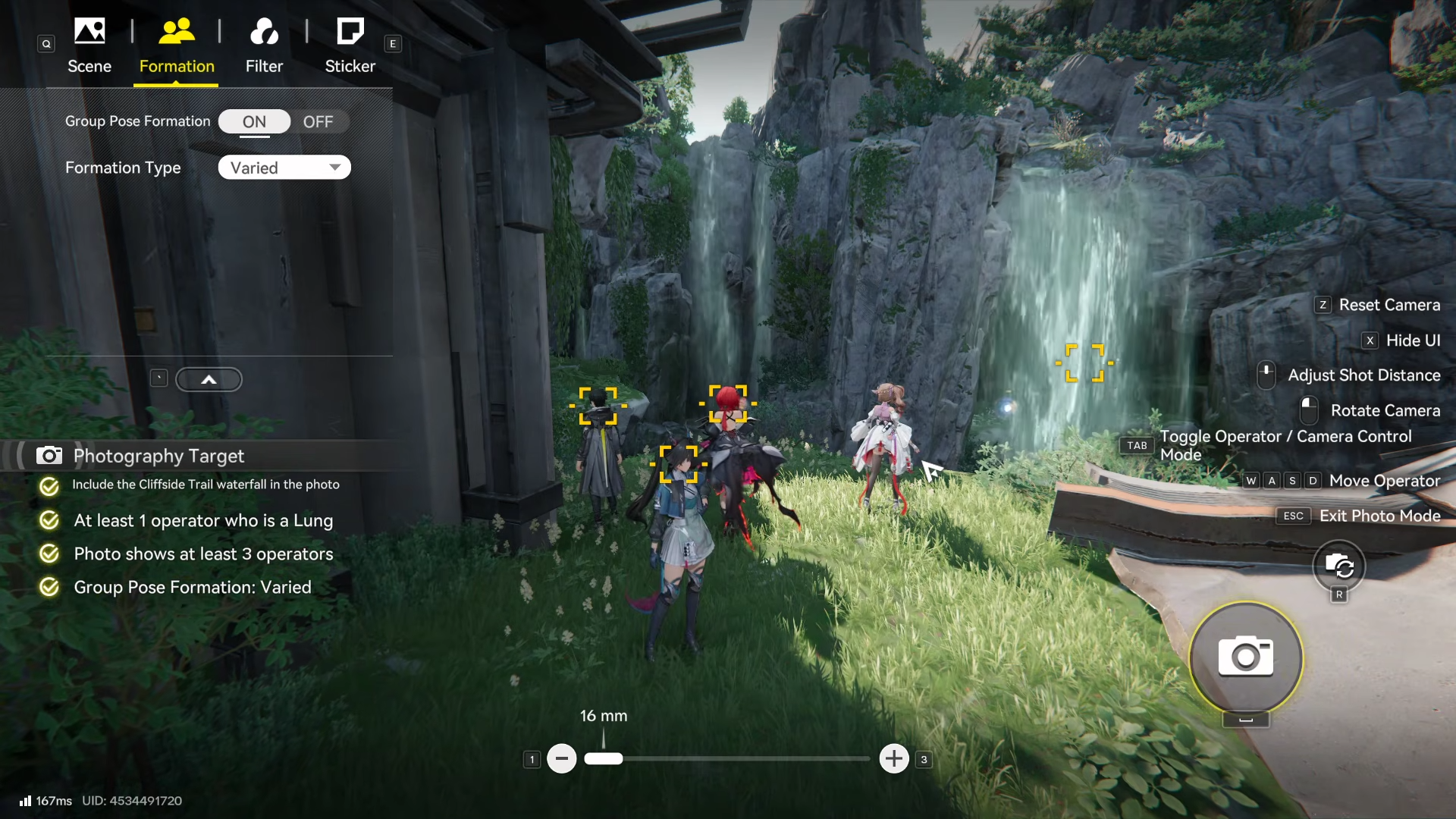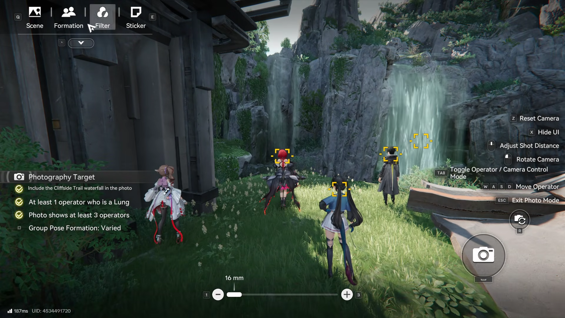 Interact with the event interface to activate the camera tool, reviewing targets: waterfall visible, 1+ Lung, 3+ operators, Varied group pose.