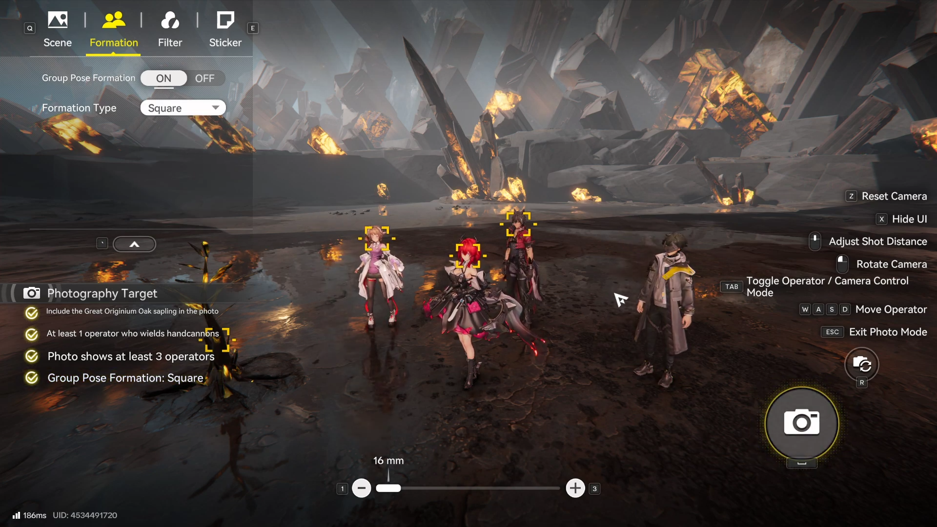 Step onto the glowing photo zone to activate Camera Mode. Position the Great Originium Oak sapling in the foreground—it’s small, so zoom out slightly and place it ahead of your team for clarity.