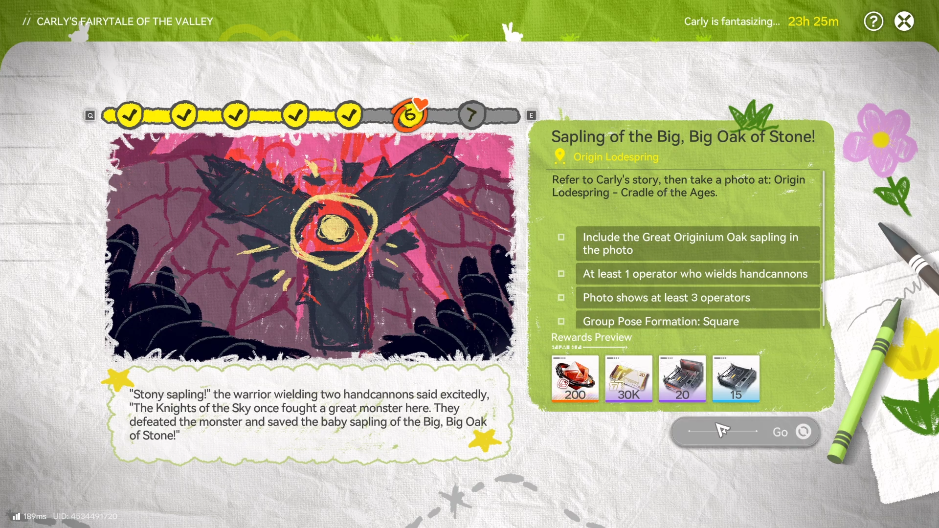 - Day 6 unlocks the “Sapling of the Big, Big Oak of Stone” photo mission in the Sketches of Innocence storyline.