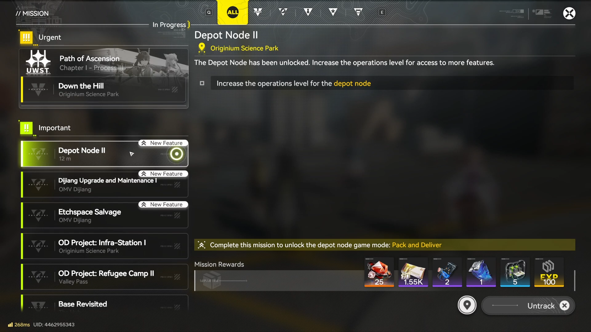 Set Depot Node II as your tracked objective so your navigation markers point you toward the correct Depot Node interactions in Originium Science Park.