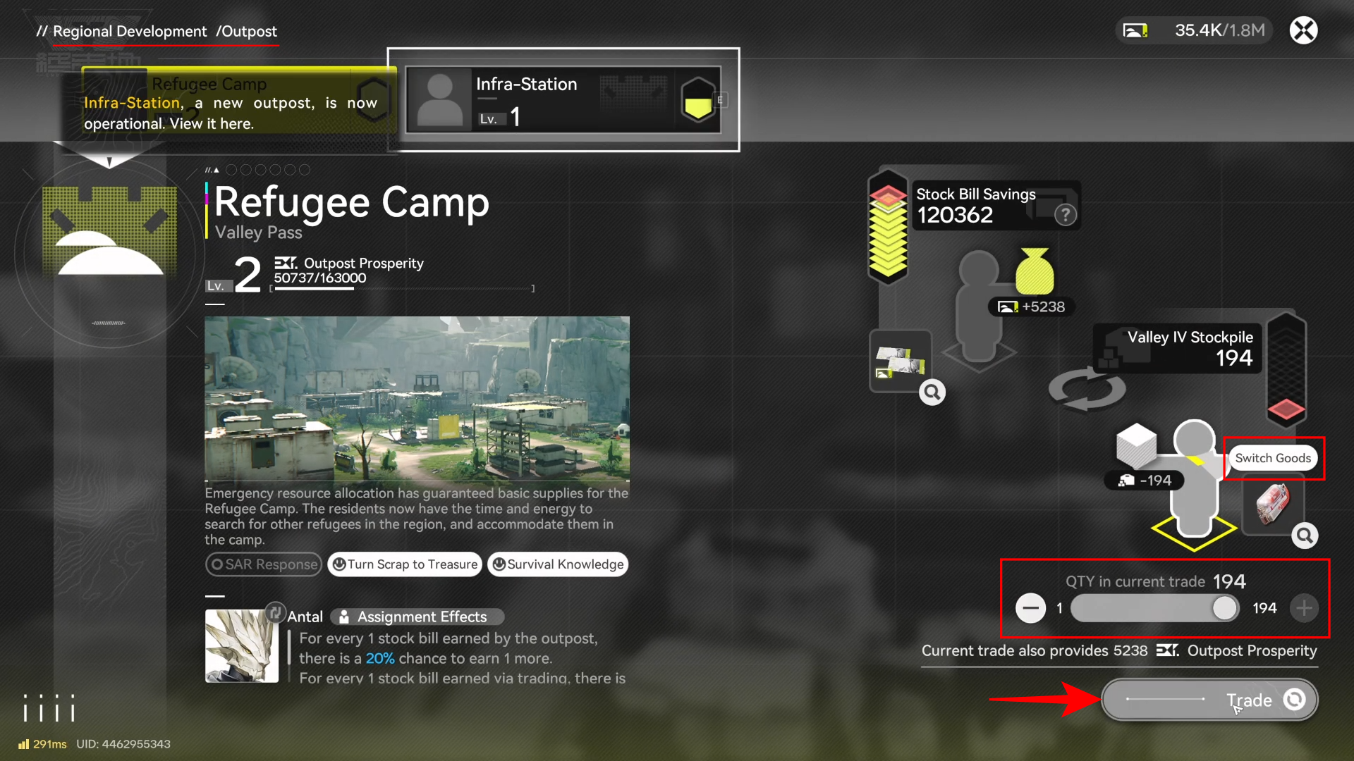 If you don’t have sufficient Stock Bills, you can trade goods from from Regional Development > Outpost Management > Switch Goods > Select Goods > Adjust QTY and select Trade.
