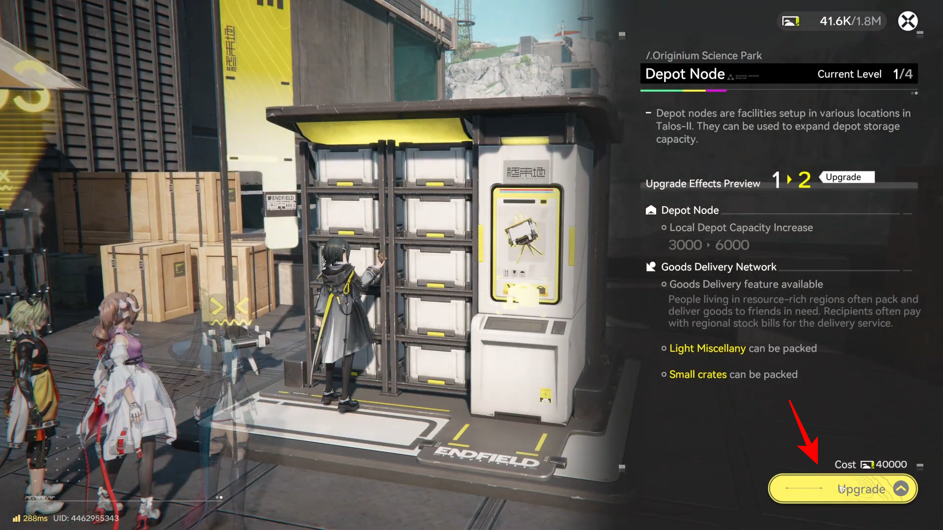 Head to the marked Depot Node location in the park and select ‘Upgrade’.