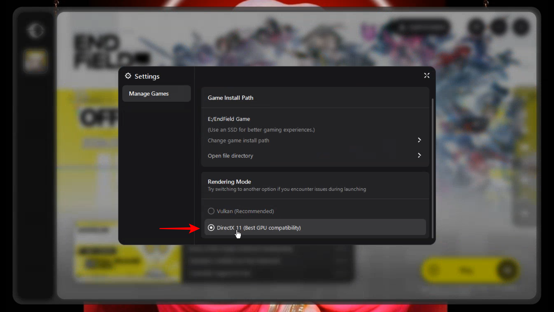 Under ‘Rendering Mode’, select “DirectX 11” (Vulkan, DX11 listed).