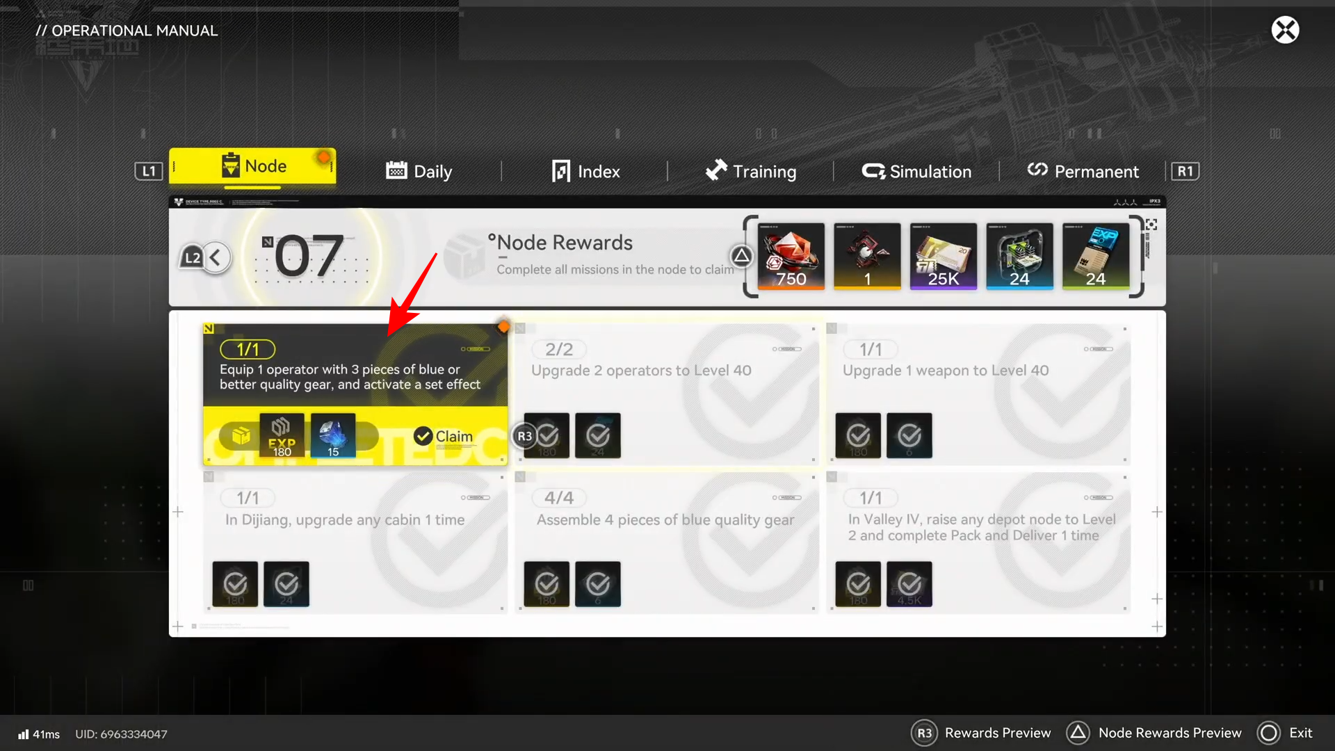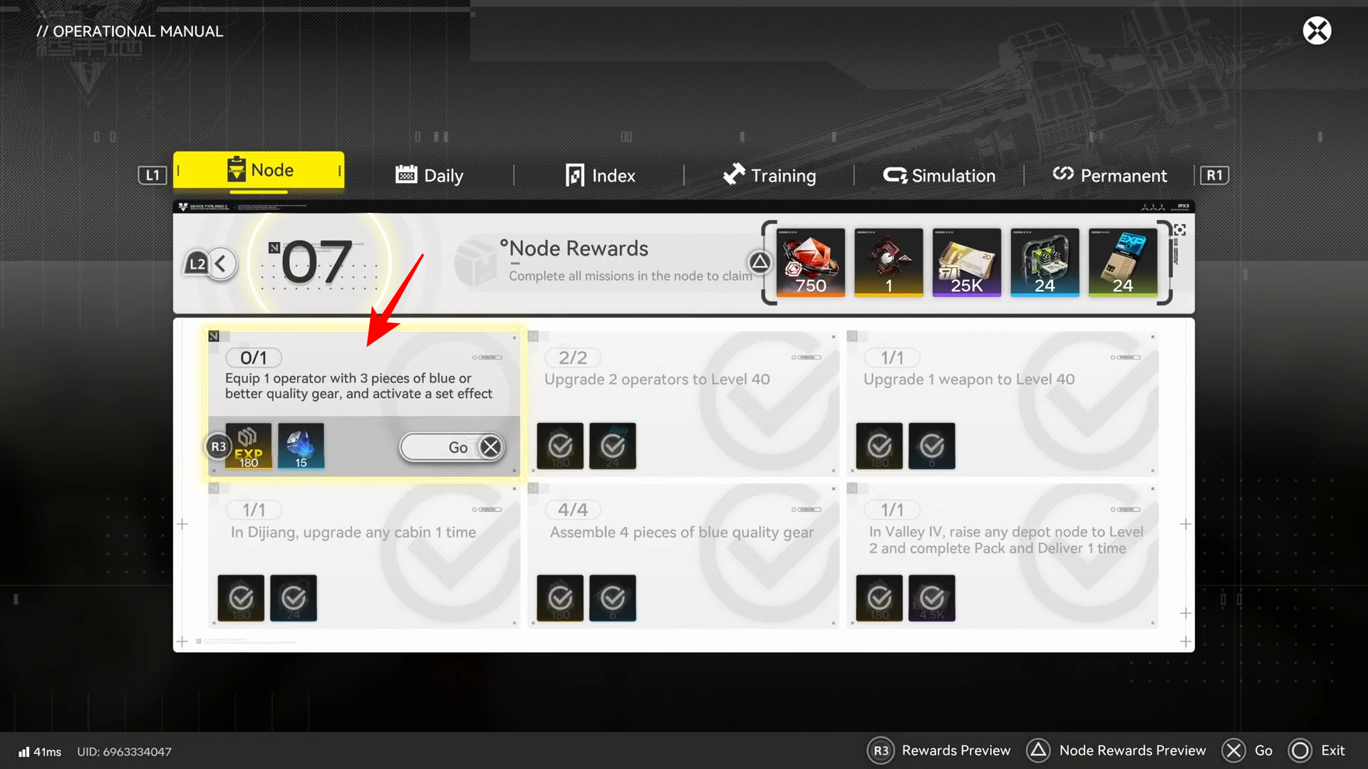 In Arknights: Endfield, one of the Node challenges requires you to “Equip operator with 3 pieces of blue or better quality gear and activate a set effect”.