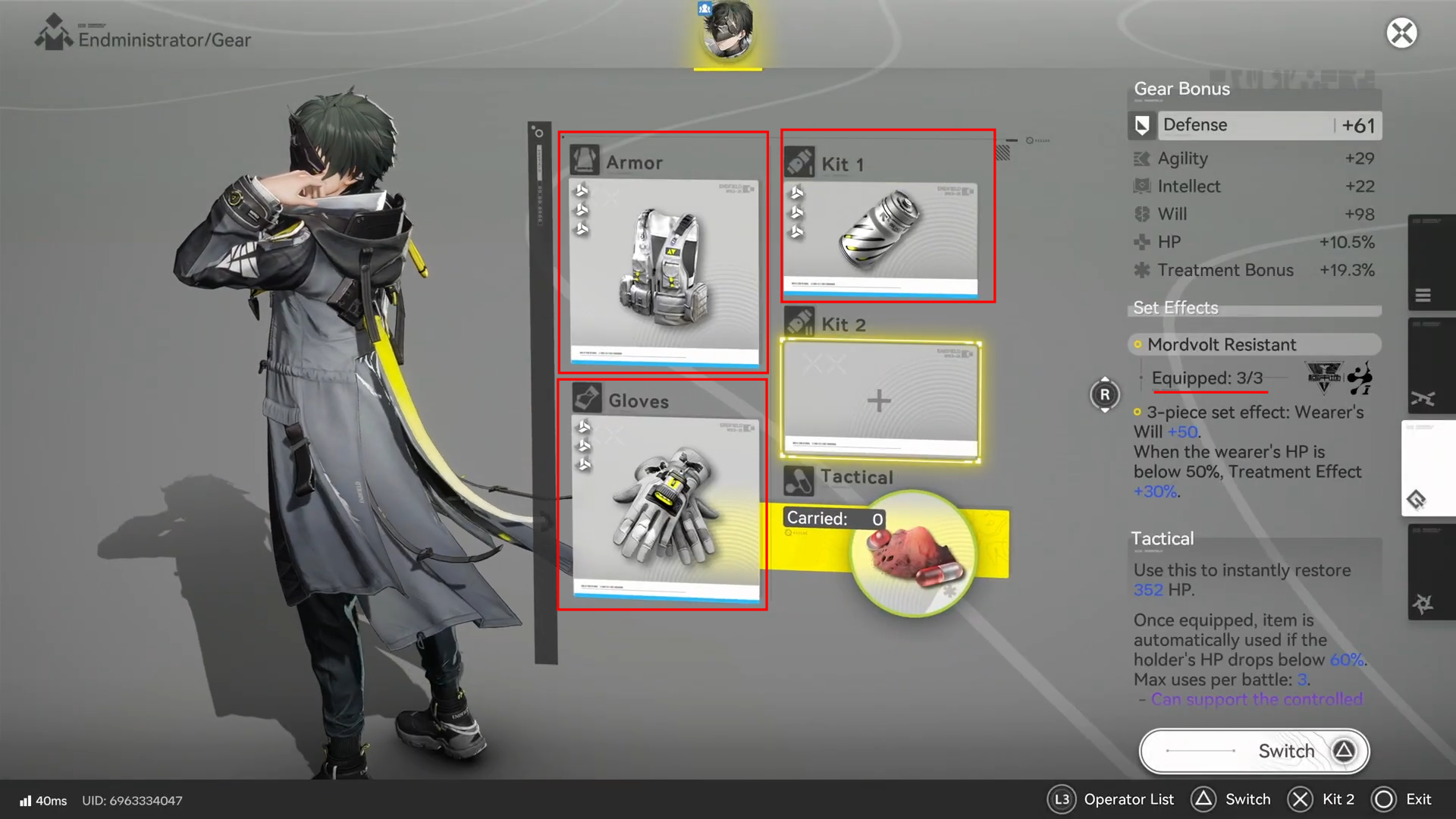 | Gear slots | Armor (1), Gloves (1), Kits (2). |