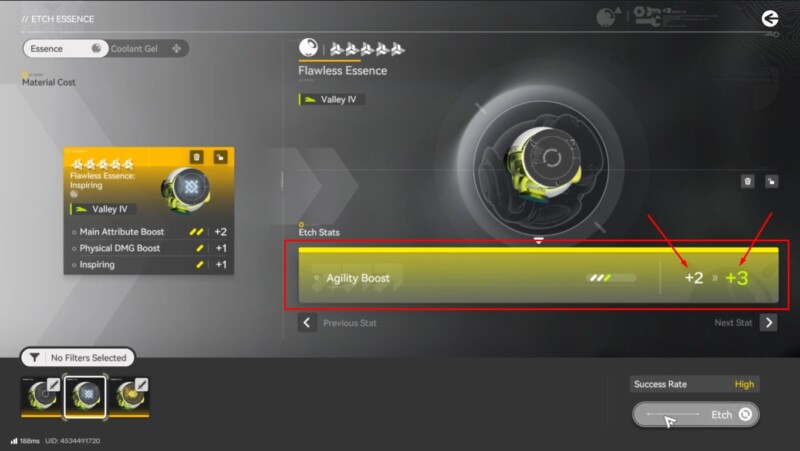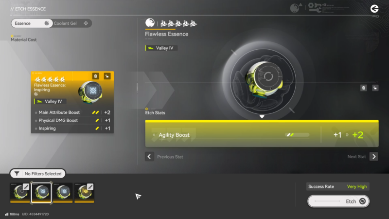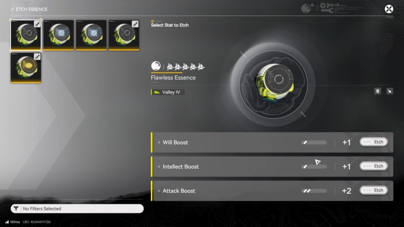 | Etch Essence | Upgrade one selected stat line on an Essence | Weapon Essence menu / Essence management screens | One successful stat level increase on a Flawless Essence |