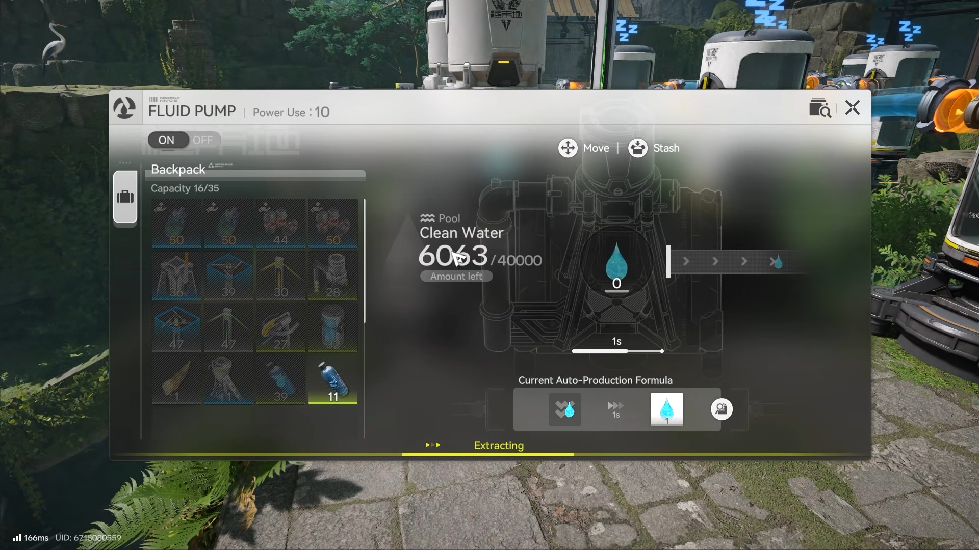 Set up your fluid extraction system precisely to pump out roughly 400,000 units of water from the pond. Start early since it runs in real-time, and you can speed it up with extra pumps connected via convergers.