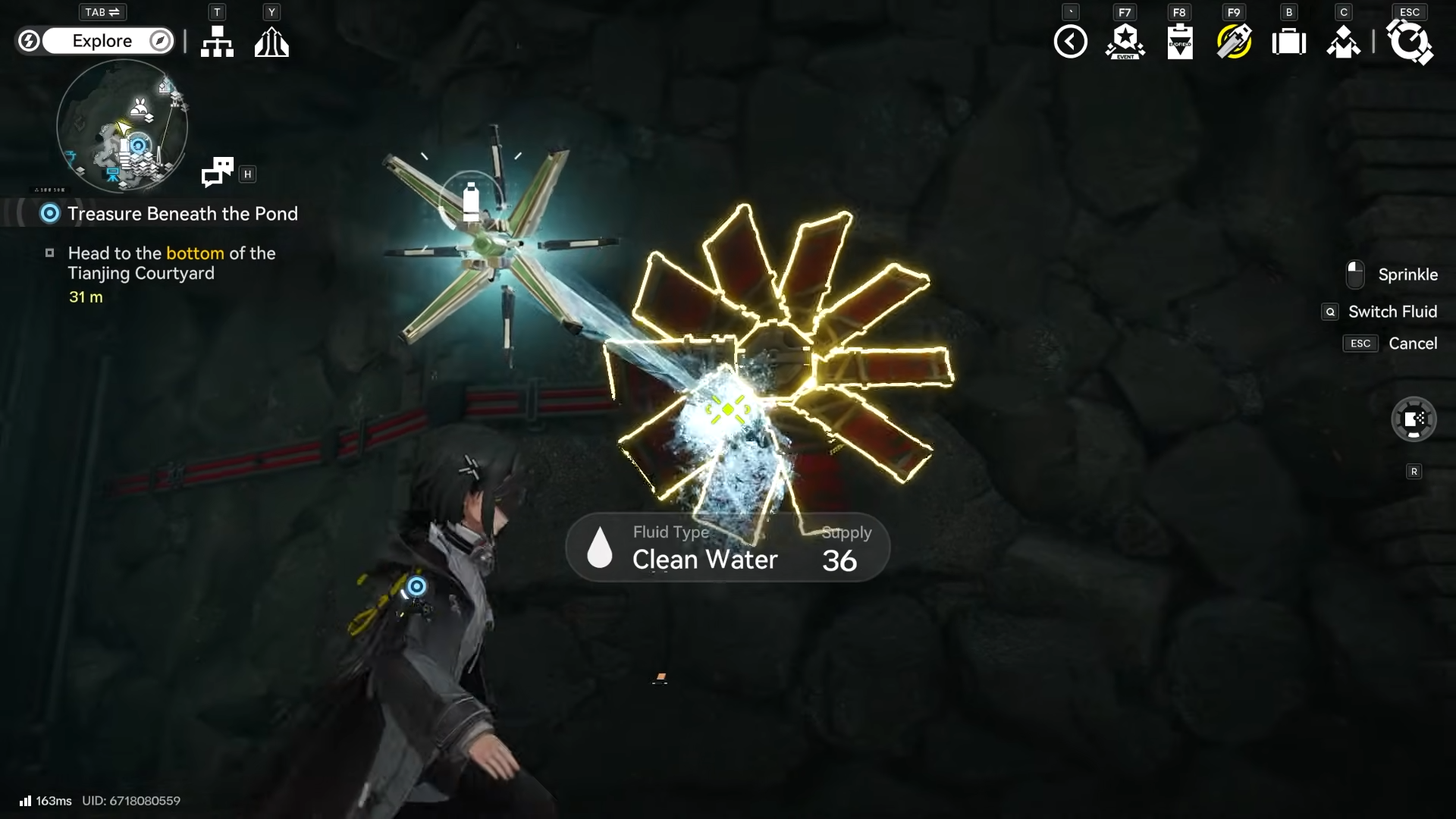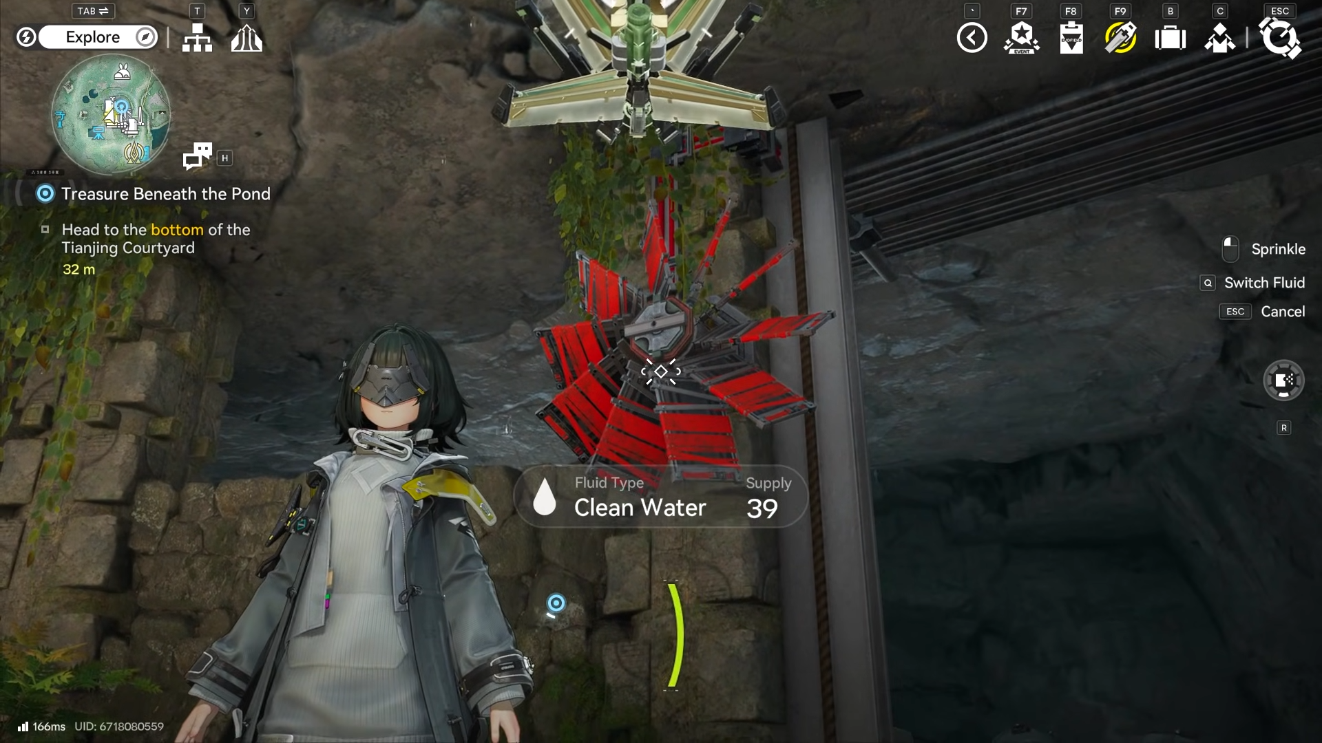 After draining, speak to Tianshi Bao for the Jet Drone hint, then descend. Equip fluid in your Jet Drone for shooting red spinning wheels.