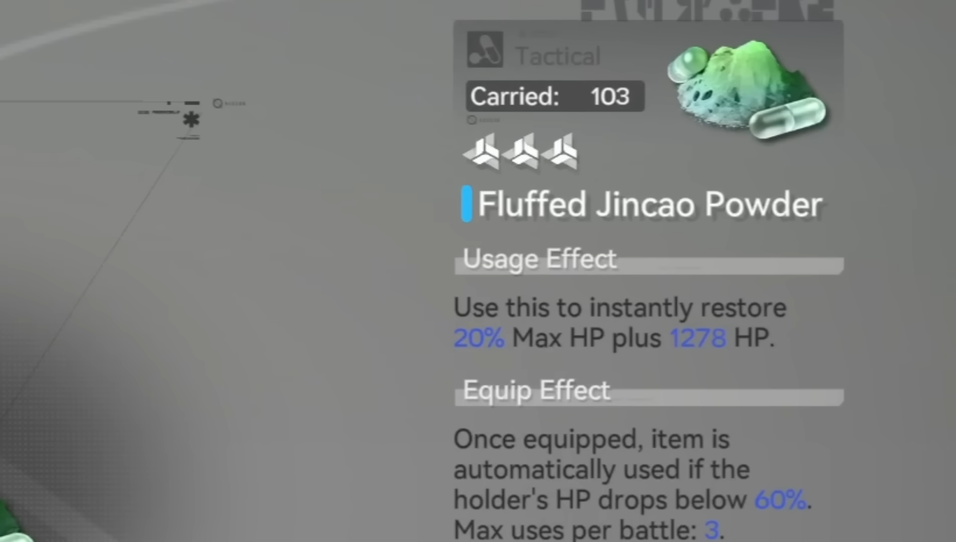 • Fluffed Jincao Powder restores 1278 HP plus 20% of max HP, which is why it stays powerful as your operators get tankier.