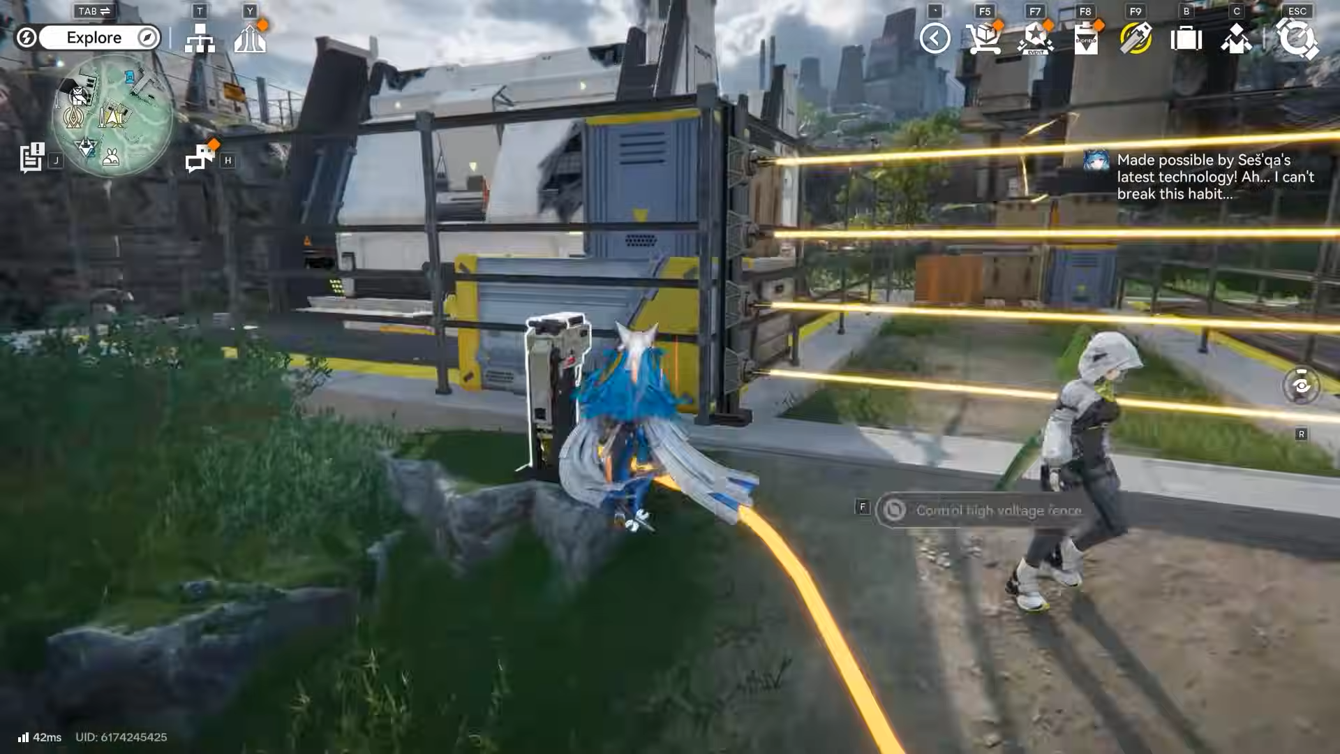 Follow the road to the left and walk along the fence to the right until you find a control panel. Use it to disable the high-voltage field.