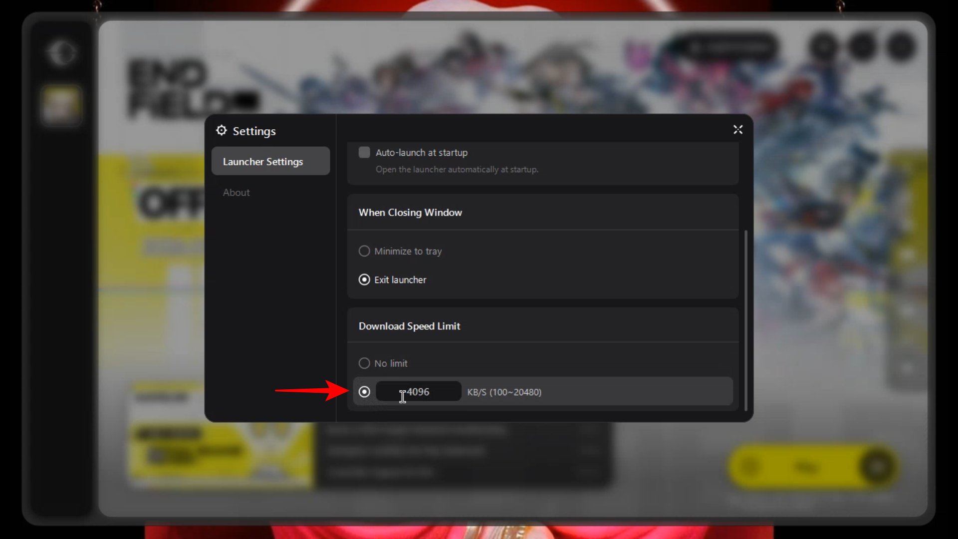 Type in the maximum speed you want the launcher to use in KB/s. The launcher supports a range from 100 KB/s up to 20,480 KB/s.