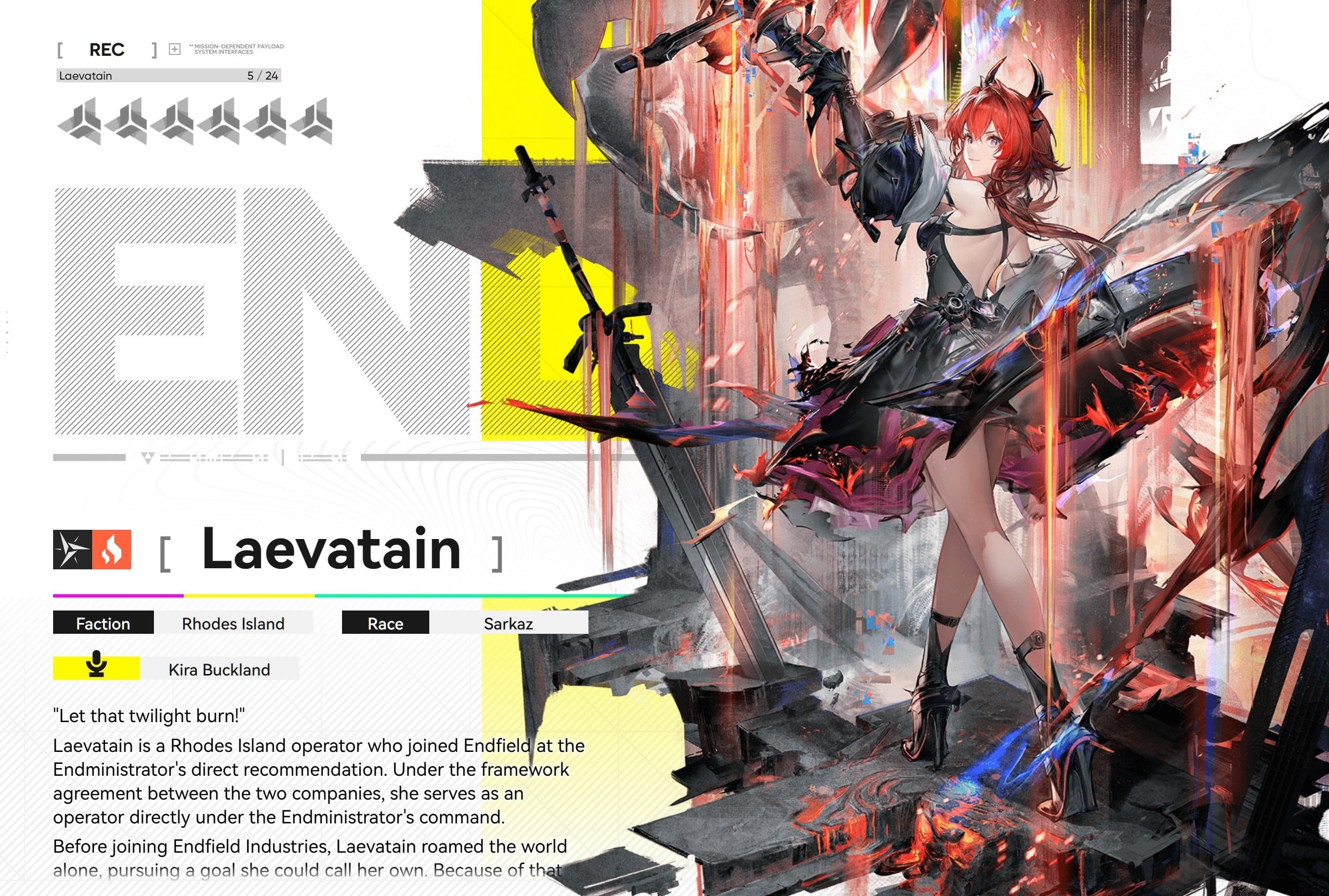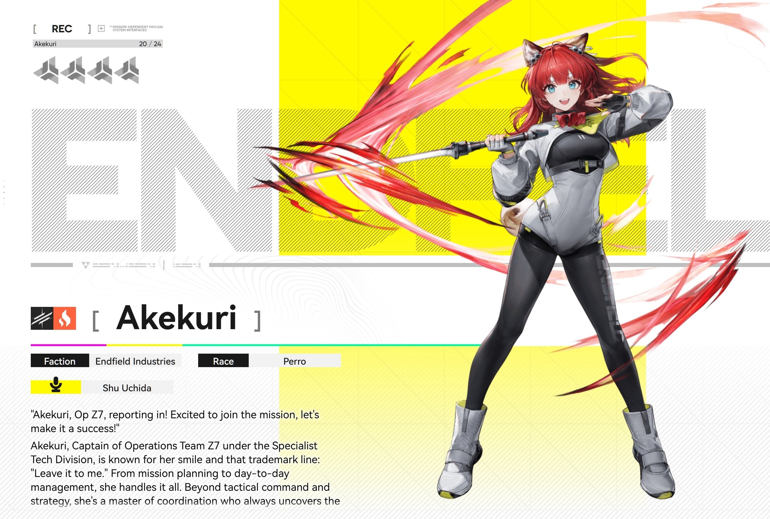 A 6-star operator from Rhodes Island who joined Endfield at the direct recommendation of the Endministrator. She works under the Endministrator’s command and brings formidable combat skills to the team. Her Heat element Striker class allows her to exploit Physical and Heat effects inflicted by allies.