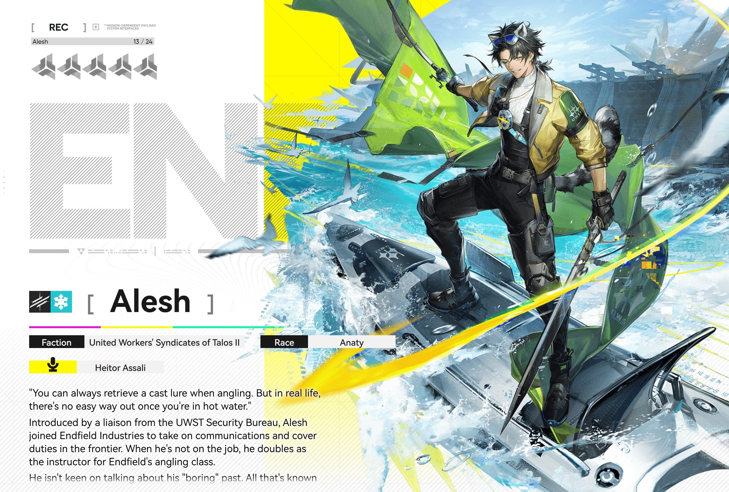 A member of the United Workers’ Syndicates faction who joined Endfield Industries to take on communication and cover duties in the frontier. Alesh is a 5-star Cryo Vanguard, specializing in SP recovery and Cryo element application to the team.