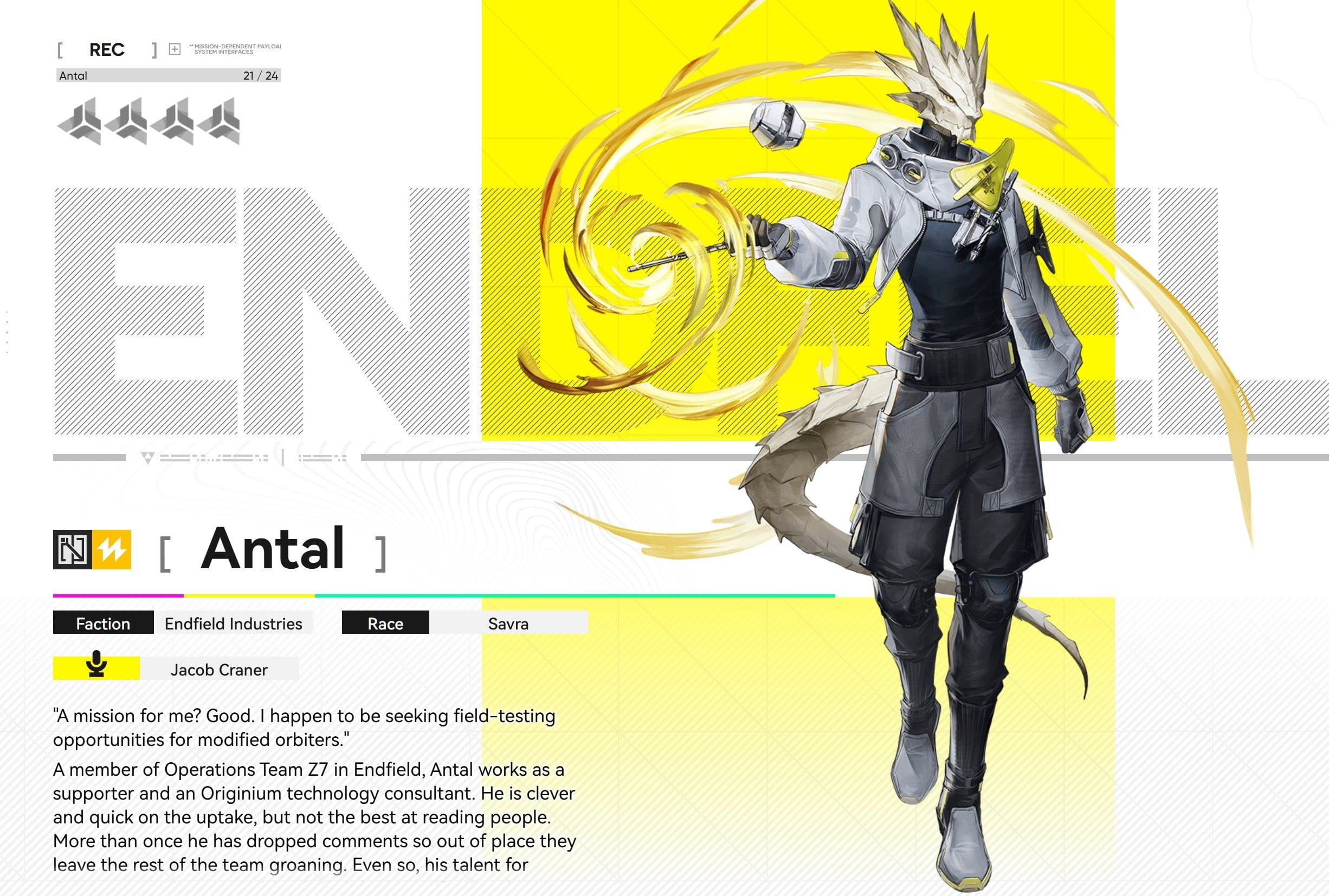 A member of Operations Team Z7 in Endfield, working as a supporter and Originium technology consultant. Antal is clever and quick on the uptake but struggles with social awareness, often making comments so out of place that they cause groaning among teammates. Despite this, his talent for Originium Arts is remarkable.