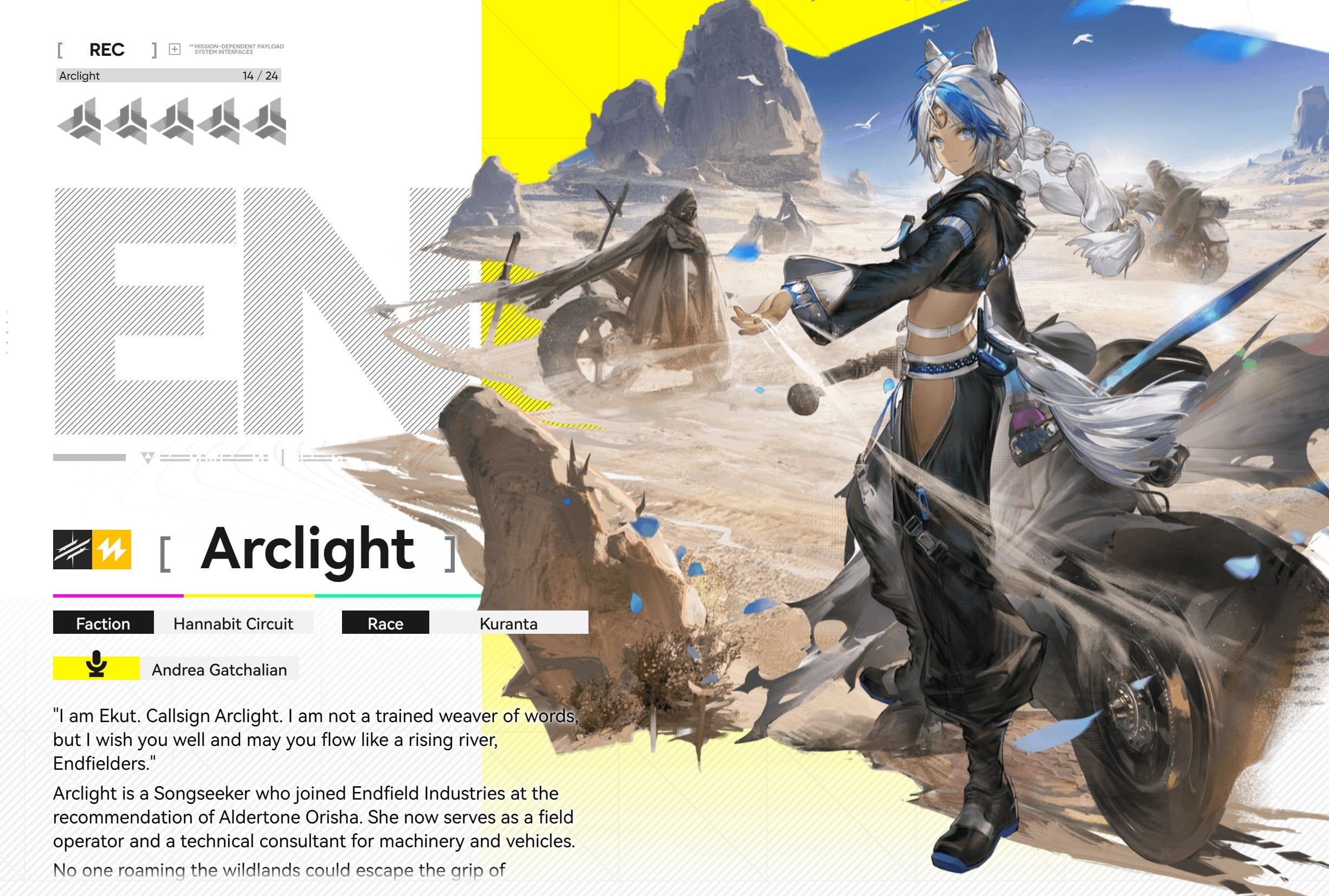 A Songseeker from the Hannabit Circuit faction who joined Endfield Industries on the recommendation of Aldertone Orisha. Arclight now serves as a field operator and technical consultant for machinery and vehicles. As a 5-star Electric Vanguard, she excels at recovering SP while providing electric damage.