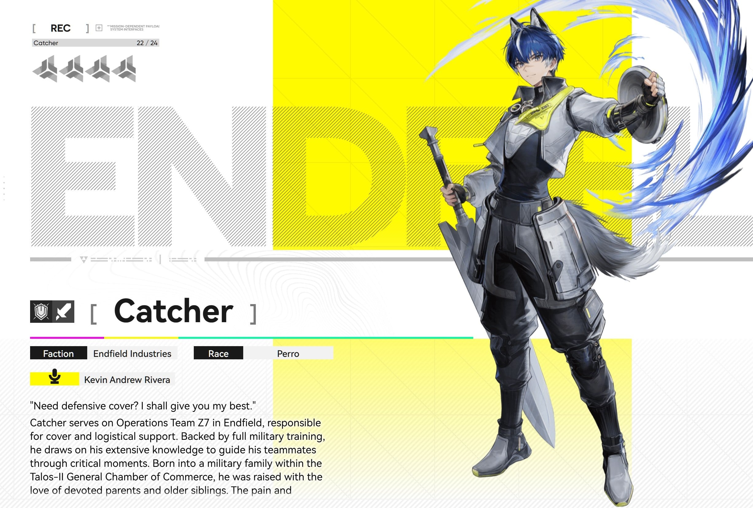 A member of Operations Team Z7 responsible for cover and logistical support. Backed by full military training, Catcher draws on extensive knowledge to guide teammates through critical moments. His Physical element and defensive capabilities make him a reliable protector.