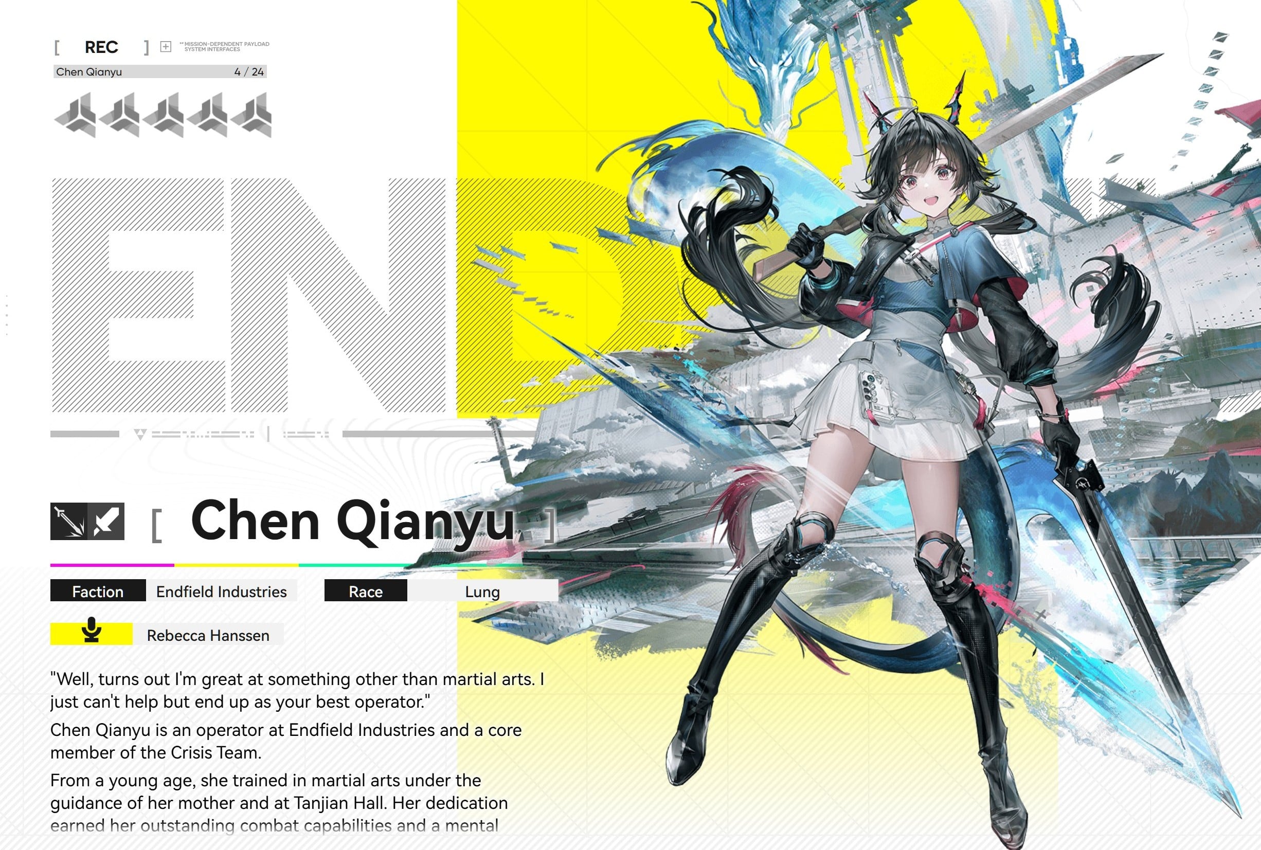 A master of martial arts and the self-proclaimed best operator of Endfield Industries. Chen Qianyu is a core member of the Crisis Team and carries significant narrative weight throughout the game. She has a history with several Wuling characters, including Tangtang and Mi Fu, and serves as a connection between the player’s team and the region’s internal politics.