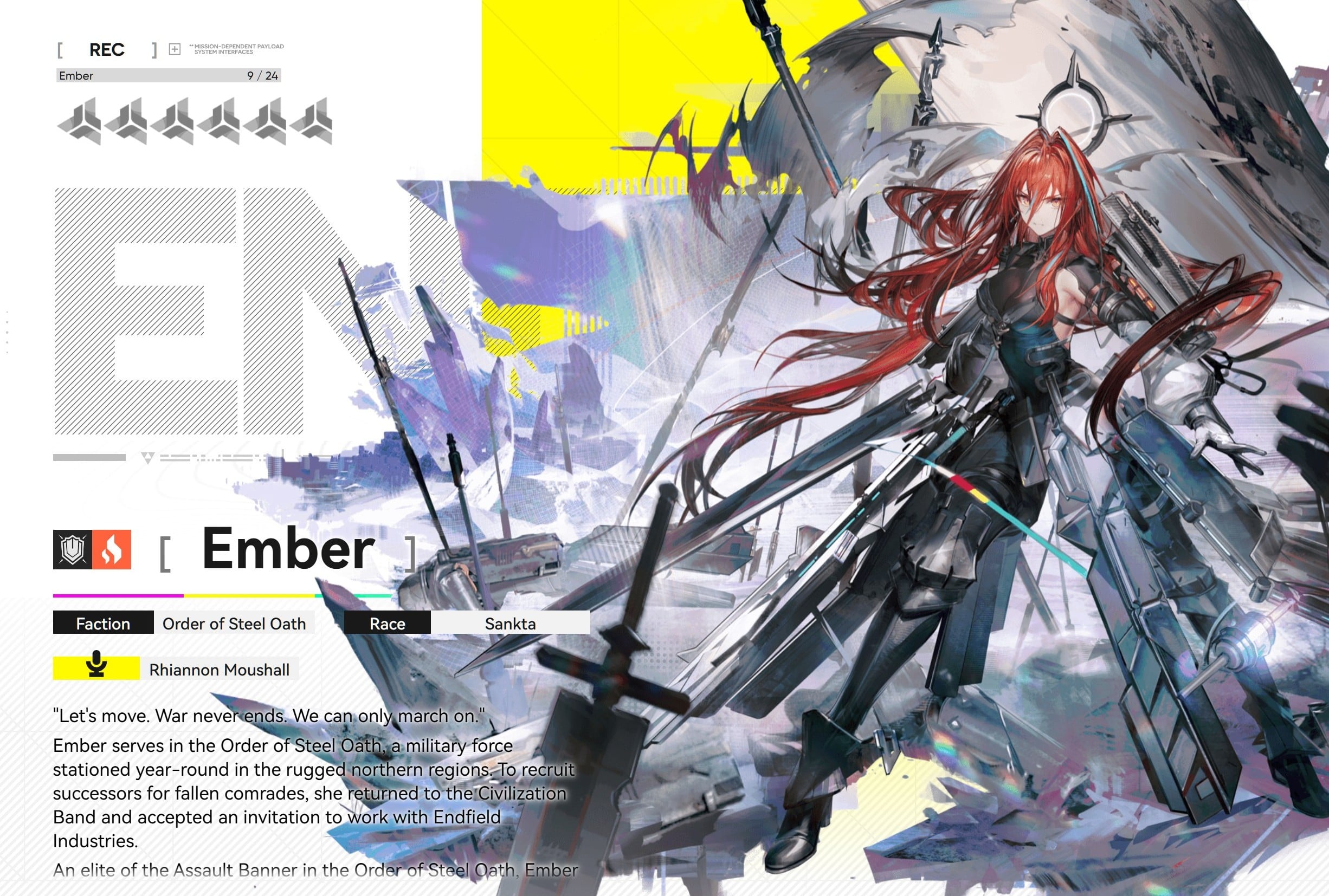 One of the strongest defensive characters in Endfield. Ember serves in the Order of Steel Oath and is renowned for elite assault techniques. Despite her defender classification, she combines toughness with powerful counterattacking abilities, making her a versatile frontline unit.