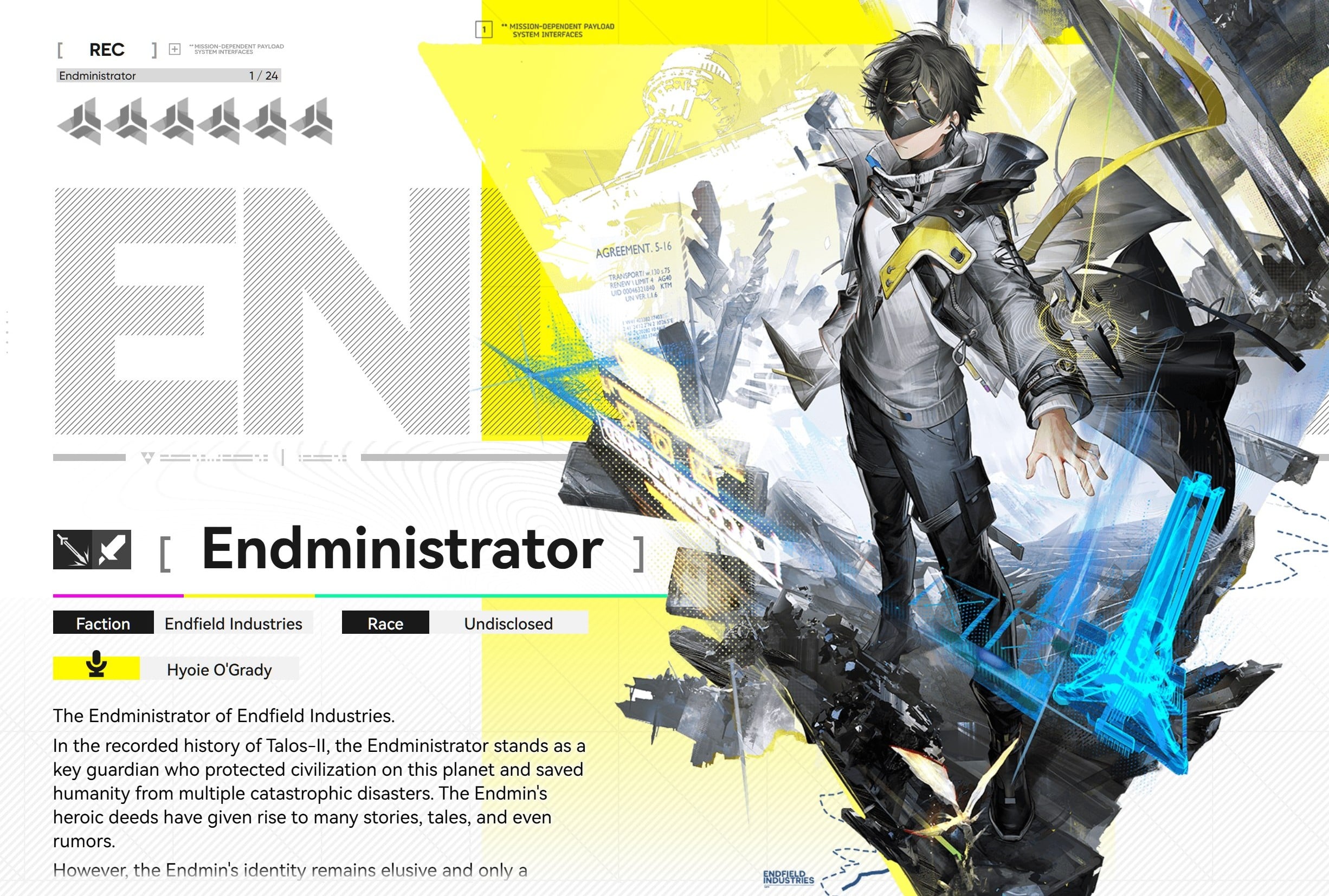 The main protagonist of Arknights Endfield. Players choose between a male or female version at game start. Endministrators are key guardians who protect civilization on Talos-II, having saved humanity from multiple catastrophic disasters. The Endministrator arrives in Wuling with an Integrated Industrial System to resolve production issues related to Xirang, a material capable of suppressing Corrosion.