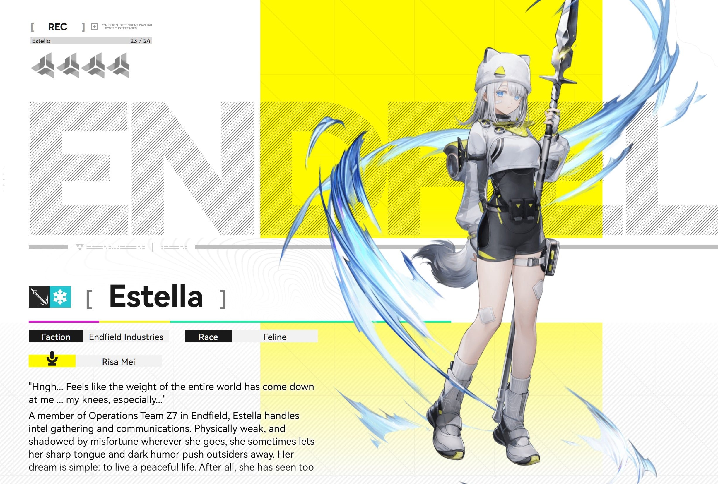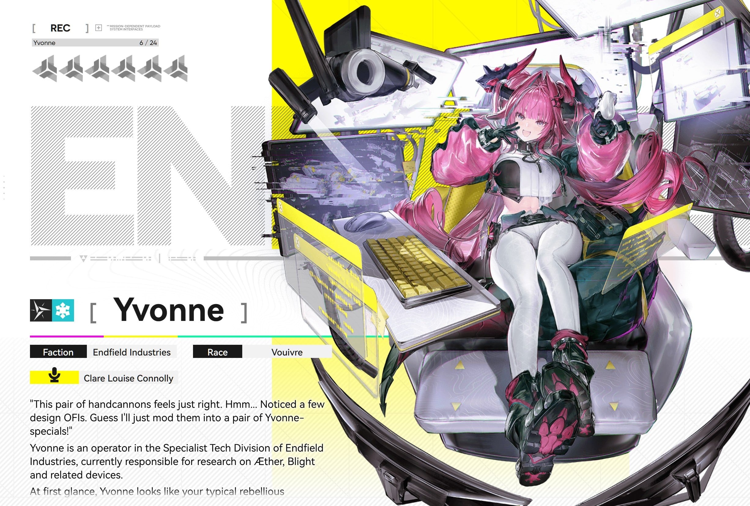 A 6-star Caster from the Specialist Tech Division of Endfield Industries. Yvonne uses the Cryo element to apply freezing effects and Arts reactions. Her fun personality and high-level skills make her both an enjoyable and powerful addition to any team.