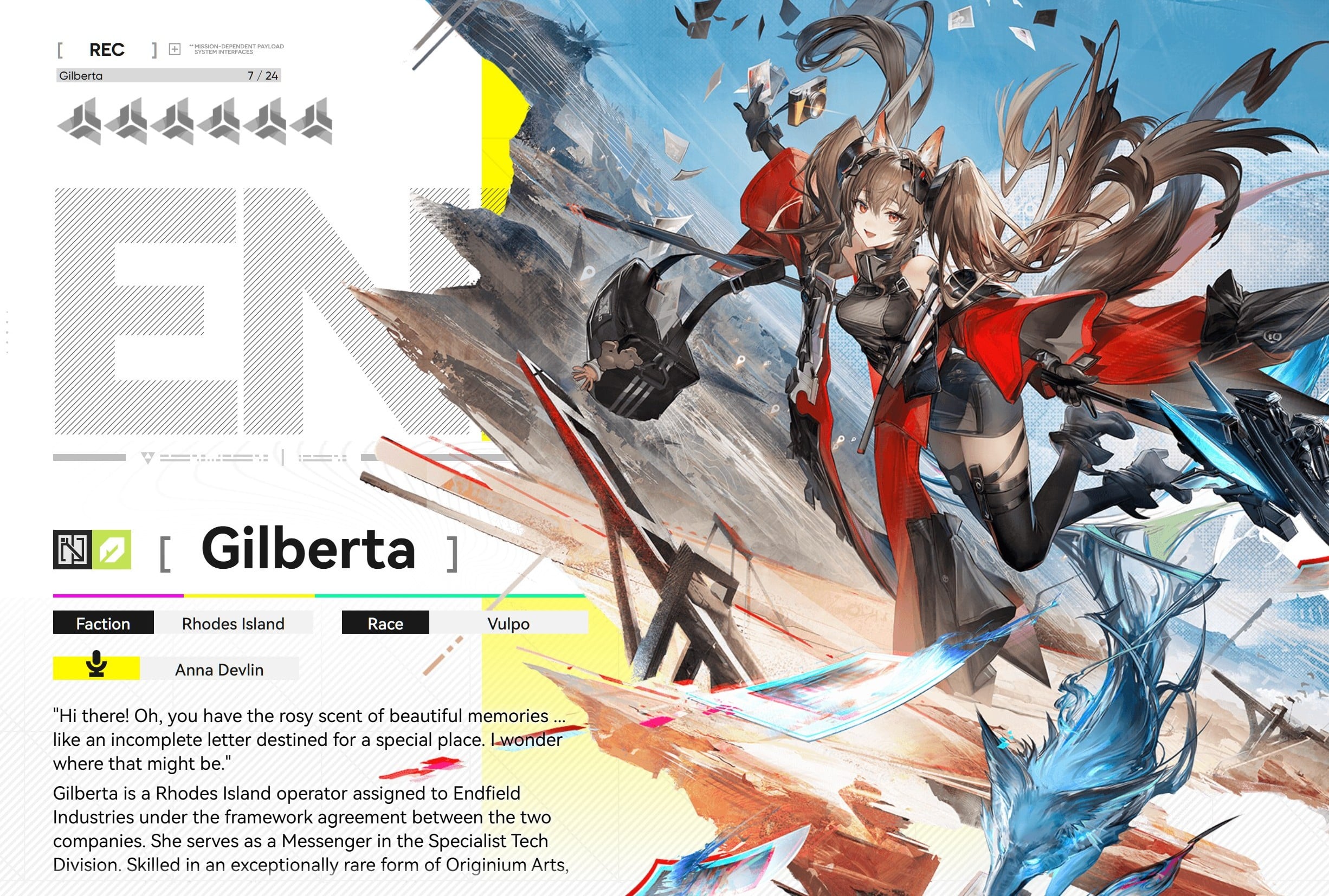 A highly skilled support operator assigned to Endfield Industries through a framework agreement with Rhodes Island. Gilberta serves as one of the best universal supports in the game, combining healing, buffing, and elemental utility in a single kit. Her expertise makes her invaluable for diverse team compositions.