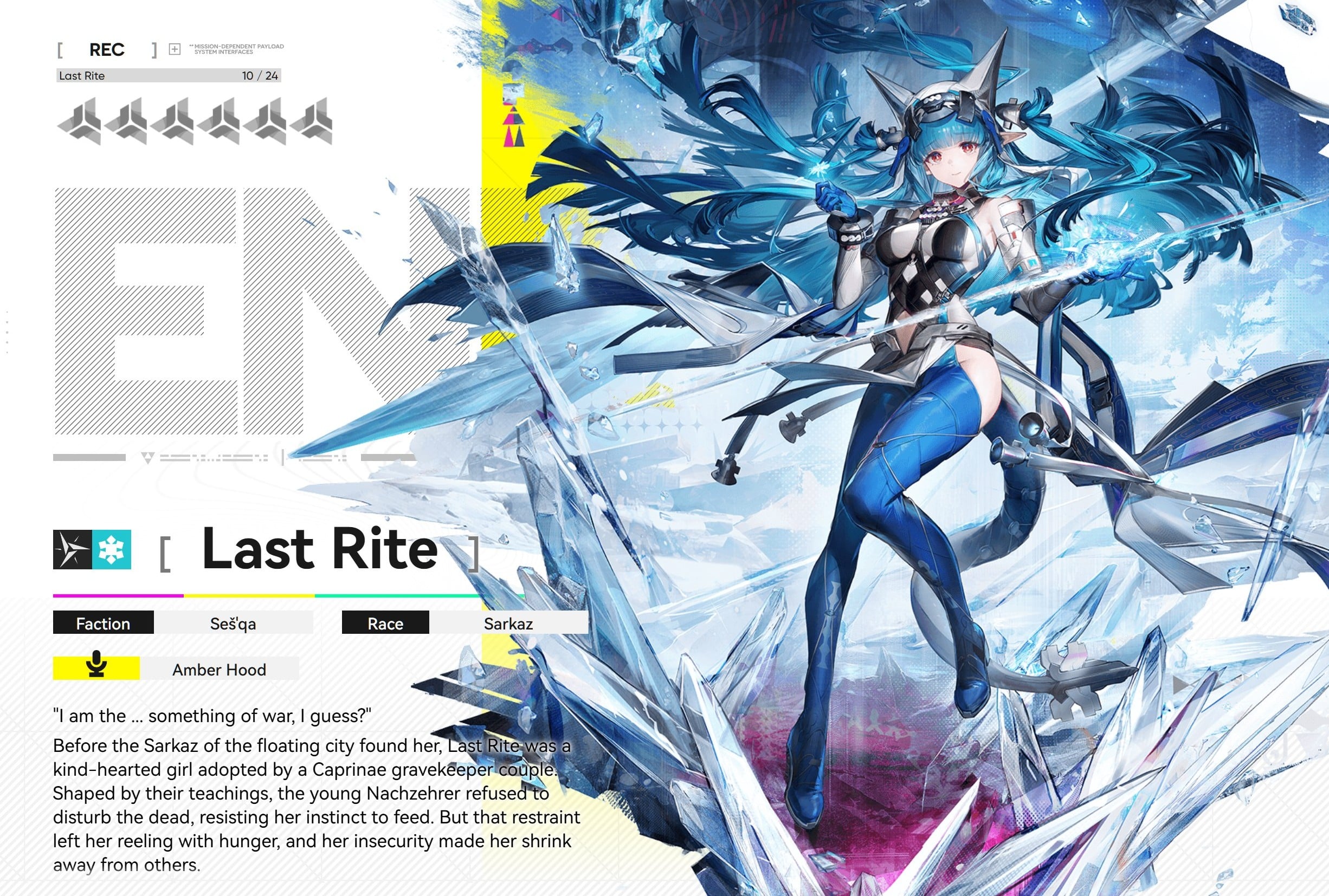 One of the more compelling characters in Endfield’s roster. Last Rite was adopted as an infant by a Caprinae gravekeeper couple. Growing up, she refused to disturb the dead and resisted her instinctive hunger, leading to deep insecurity. She later discovered her potential as a Sesqa and trained to become one. Her Cryo Striker abilities allow her to deal decisive damage through elemental reactions.