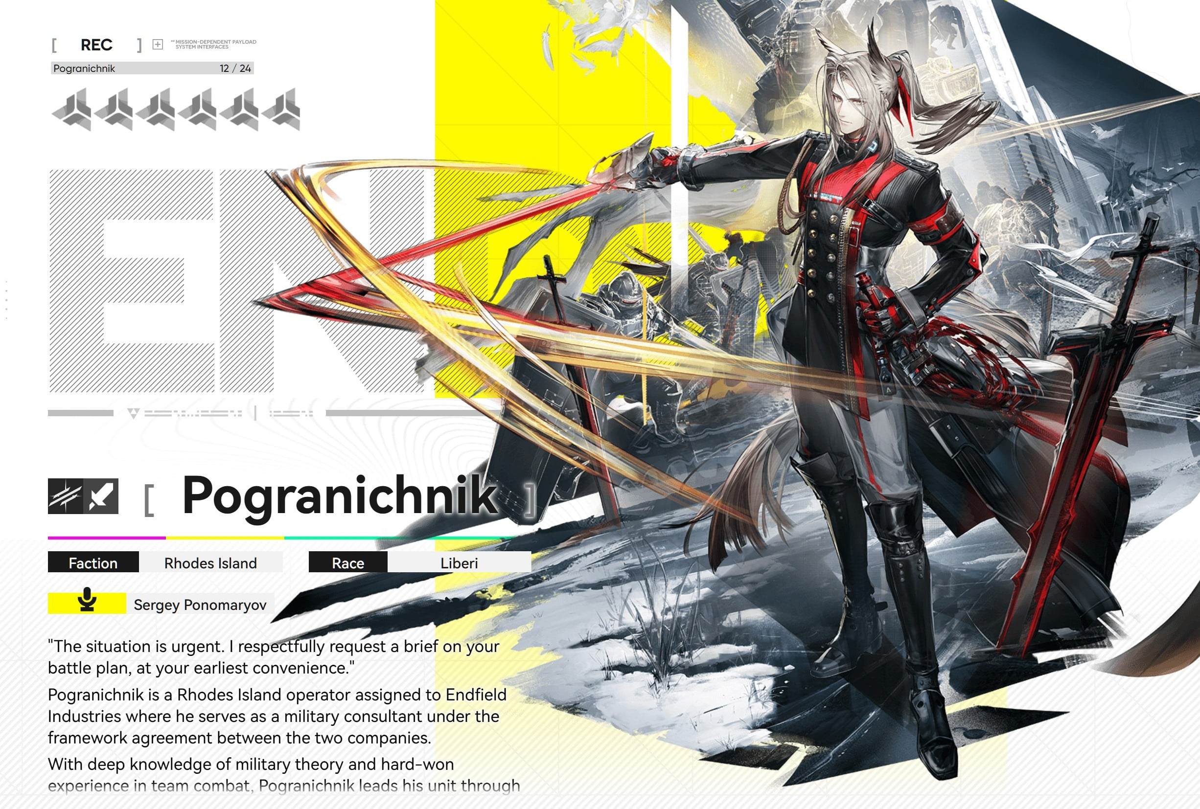 A 6-star Vanguard from Rhodes Island who once commanded the Shieldguard banner in the Order of Shield Oath. Pogranichnik is excellent at recovering Skill Points to help teammates cast their abilities, making him a cornerstone vanguard for SP-dependent team compositions.