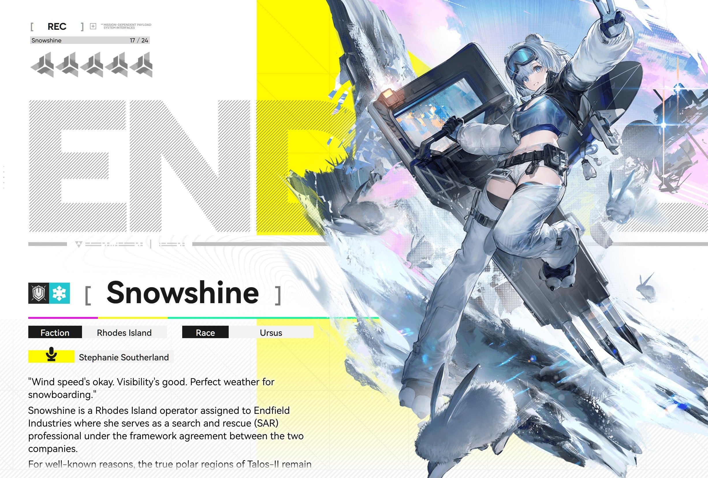 A Rhodes Island search and rescue professional assigned to Endfield Industries. Snowshine is extremely tough and skilled in protecting and treating her teammates while counterattacking enemies. Her Cryo element provides additional crowd control opportunities.