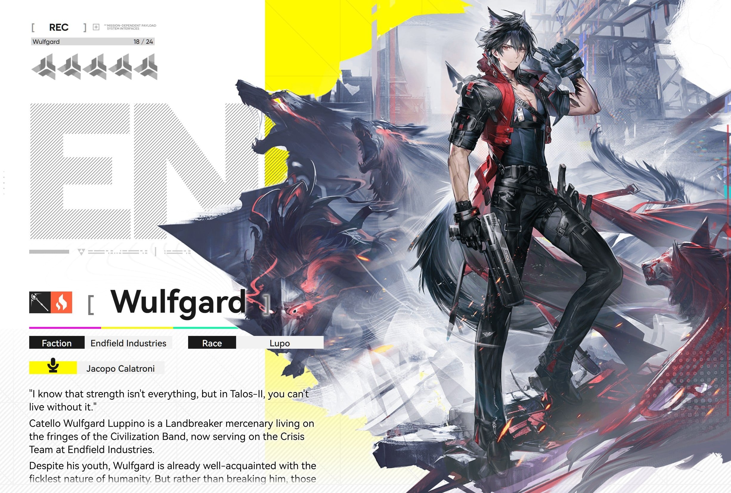 Catello Wulfgard Luppino is a Landbreaker mercenary who lived on the fringes of the Civilization Band before joining the Crisis Team at Endfield Industries. As a 5-star Heat Caster, he specializes in enabling Arts Reactions for both explosive bursts and continuous damage output. His abilities reliably inflict Heat and trigger Combustion.
