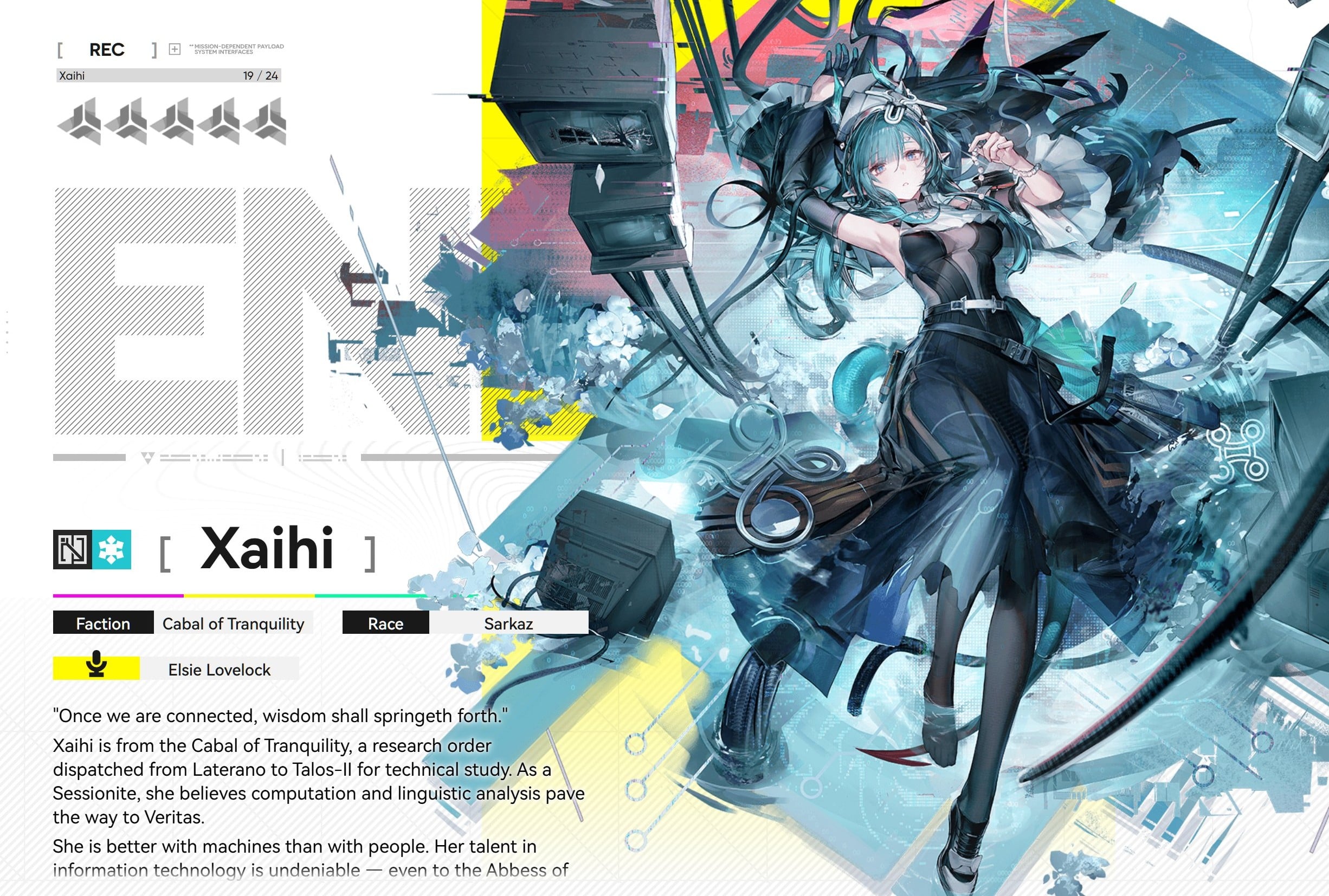 A Sessionite researcher dispatched from Laterano to Talos-II for technical study. Xaihi believes in the power of computation and logistic analysis to reach Veritas. As a 5-star Cryo Support, she applies control effects that weaken enemies while buffing and supporting teammates.