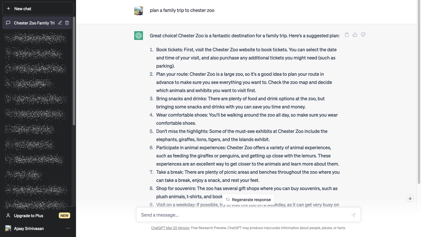 Let’s say, for example, we want to “plan a family trip to the Chester Zoo”. If you ask ChatGPT to get this done, it will provide you with a list of things you should know. This list suggests you book tickets, find a route, what you should bring, and what you may get to see.