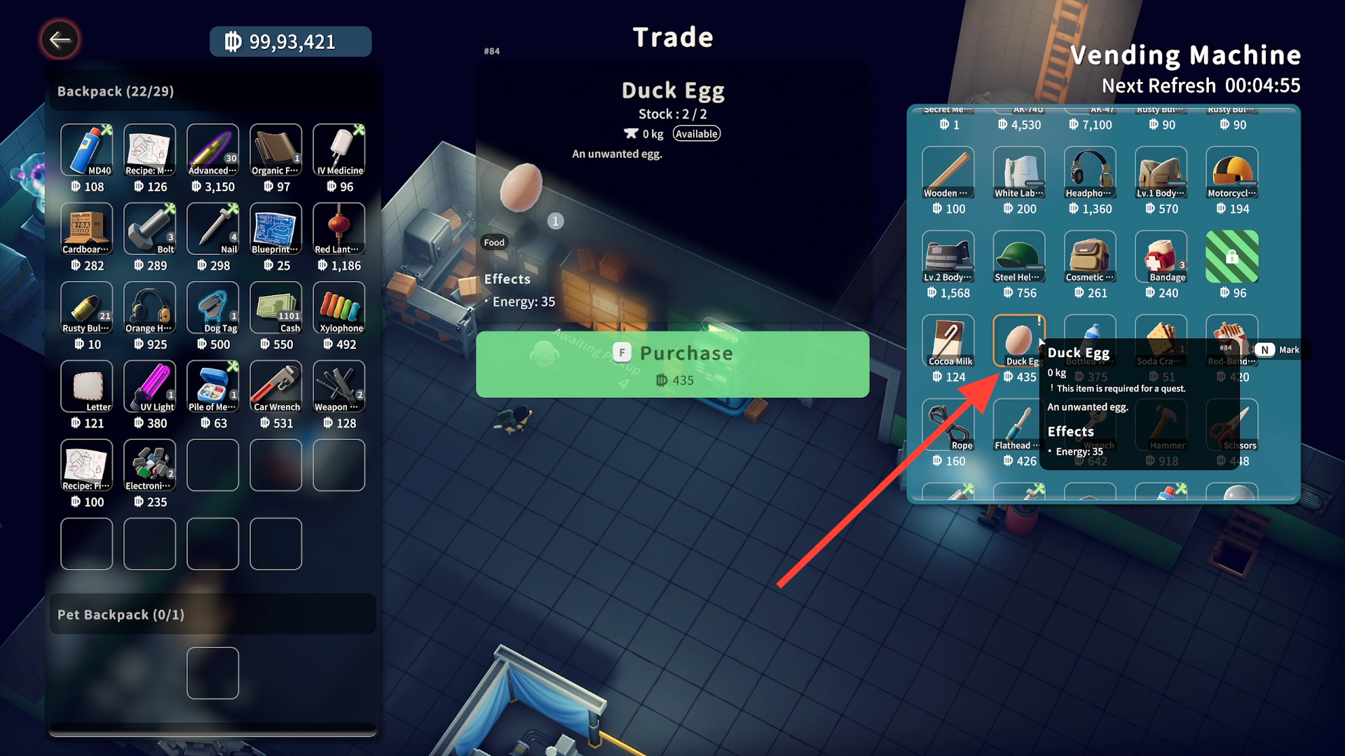 While exploring the map, locate and pick up a duck egg. You can also buy it from the Vending machine.