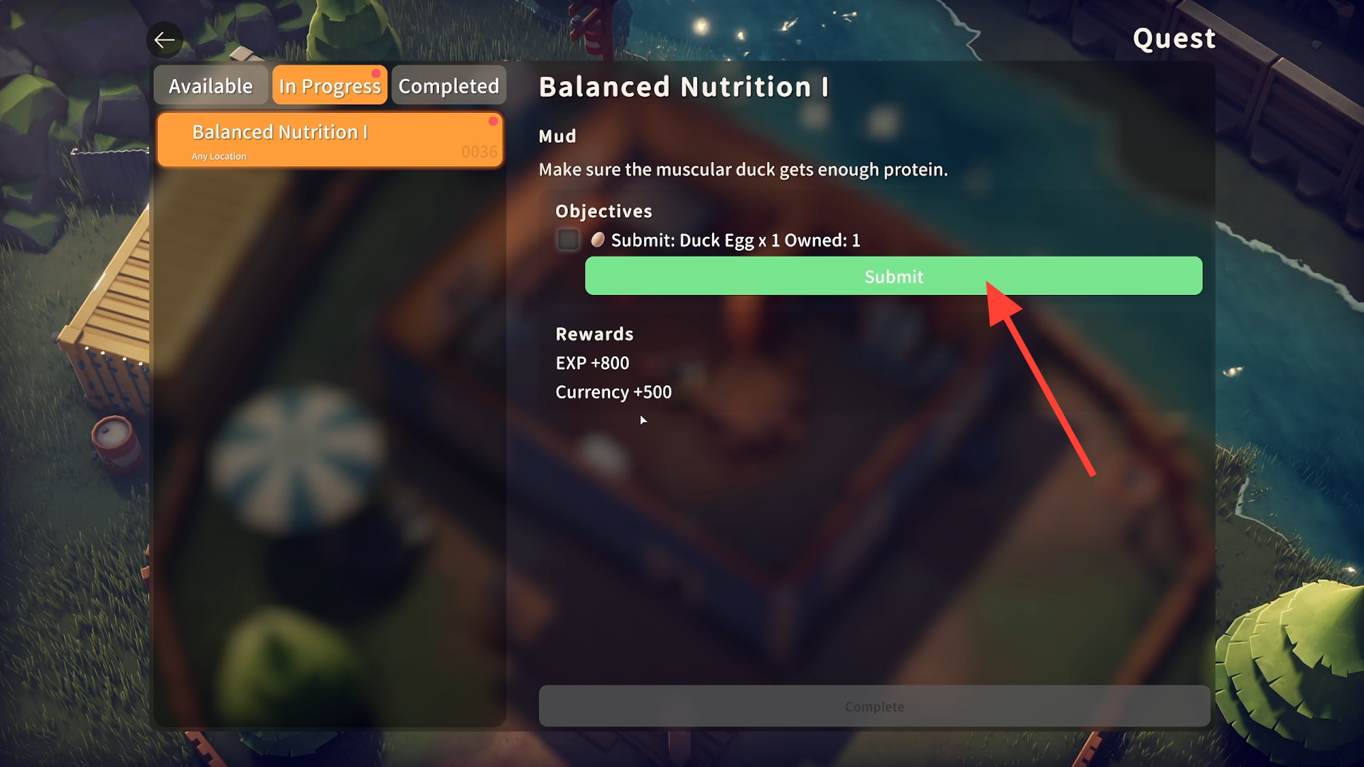 Give the Duck egg to Mud in order to complete the quest.