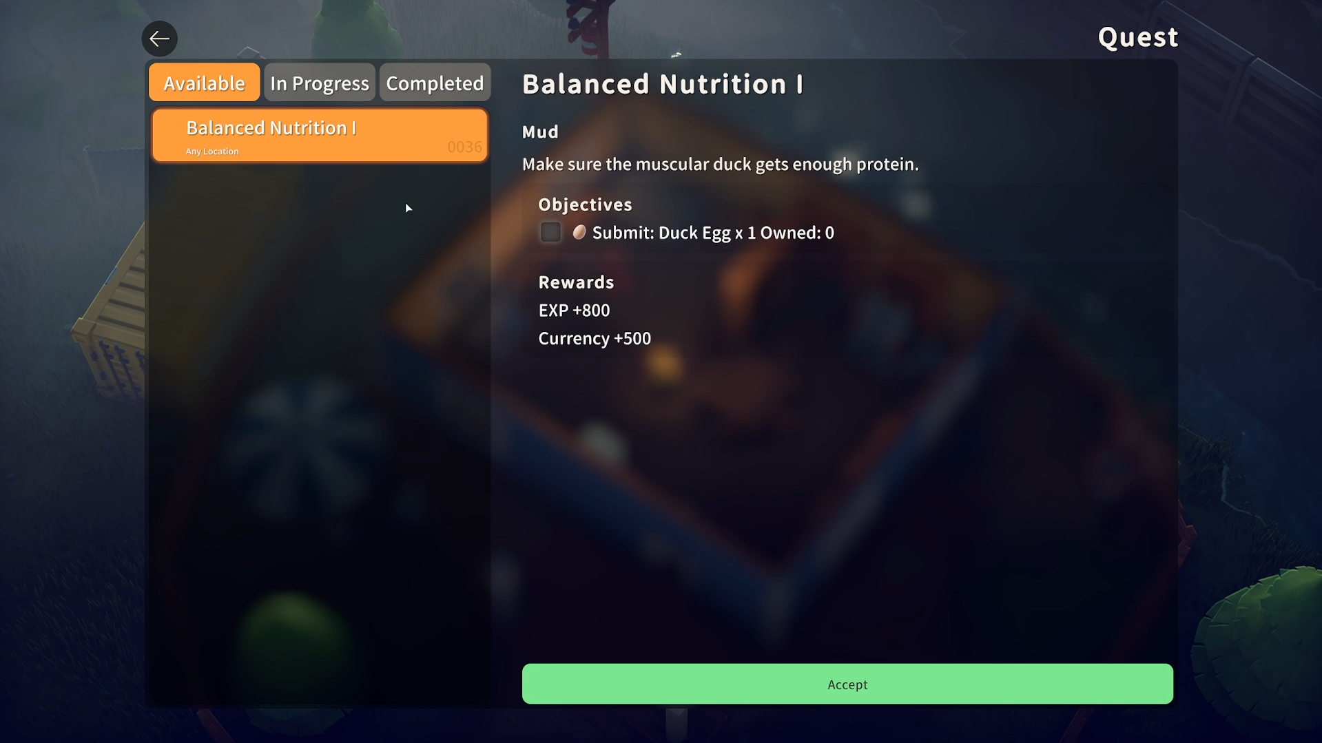| Balanced Nutrition I | 800 XP, 500 Currency |