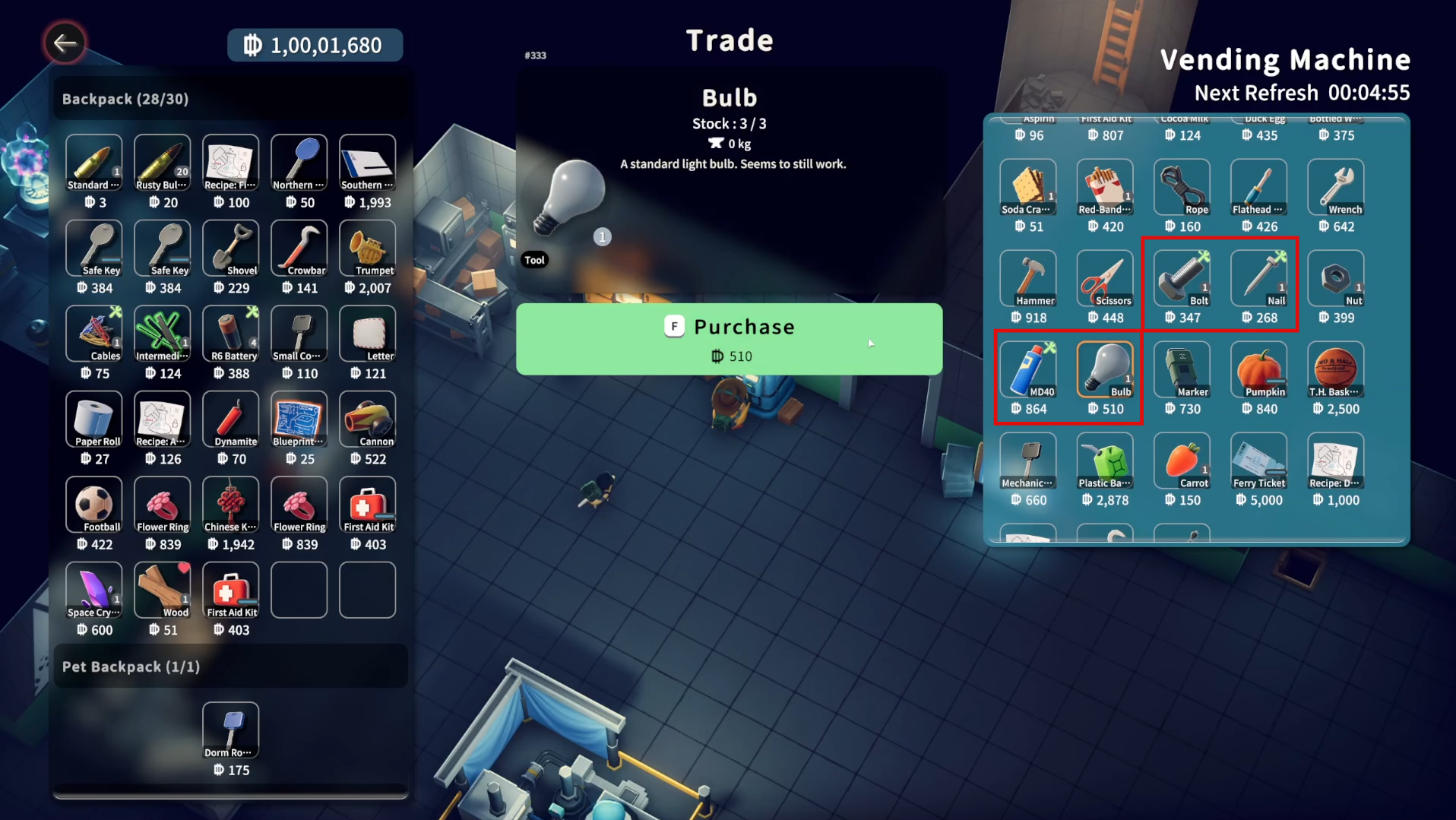 Gather or loot 2 Bolts, 2 Nails, 1 Eco-Lamp and 1 MD40. They can be found in loot boxes and can also be bought from the Vending machine.