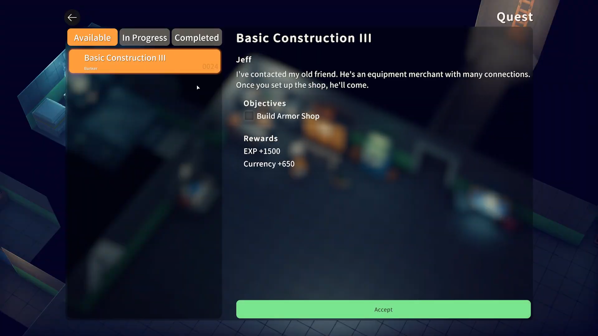 After building the Armor Shop, talk to Jeff in order to complete the quest and claim your rewards.