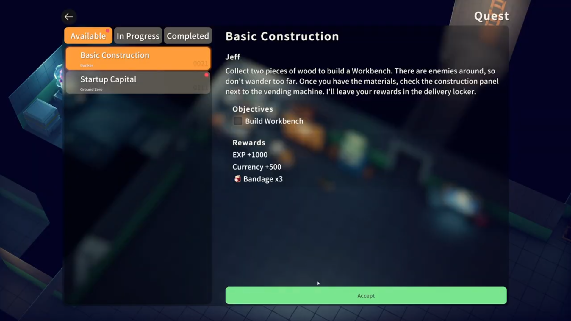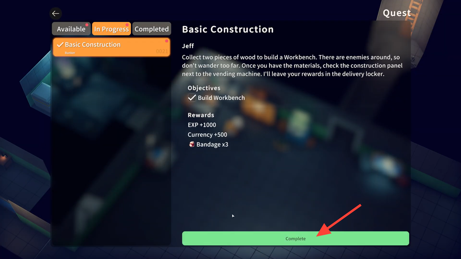 After constructing the workbench, return to Jeff and submit it to complete the "Basic Construction" quest. This will reward you with experience points, currency, and bandages.