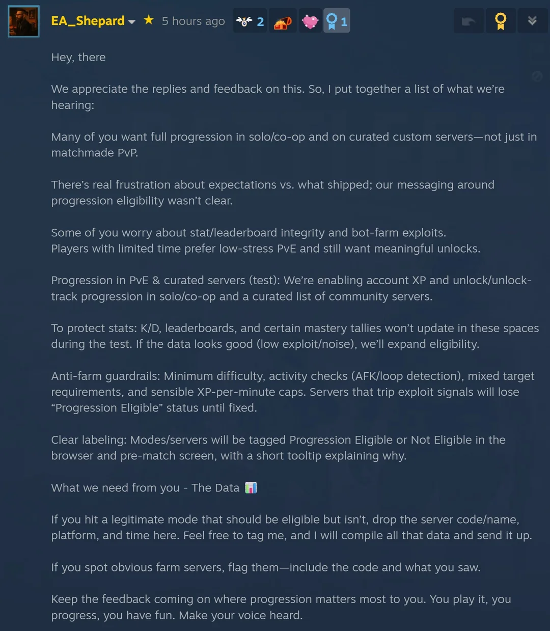 We’re in the process of deploying several backend updates aimed at improving community experiences and encouraging more player-filled servers. A more detailed update explaining these changes is targeted for tomorrow.