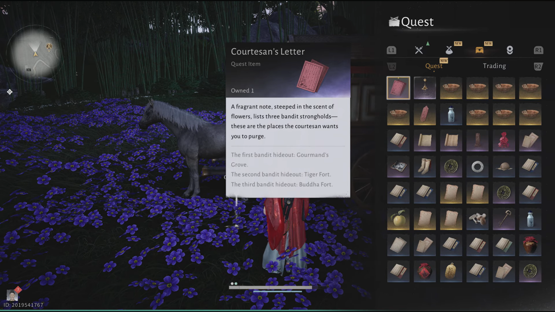 The letter reads- "A fragrant note, steeped in the scent of flowers, lists three bandit strongholds – these are the places the courtesan wants you to purge."