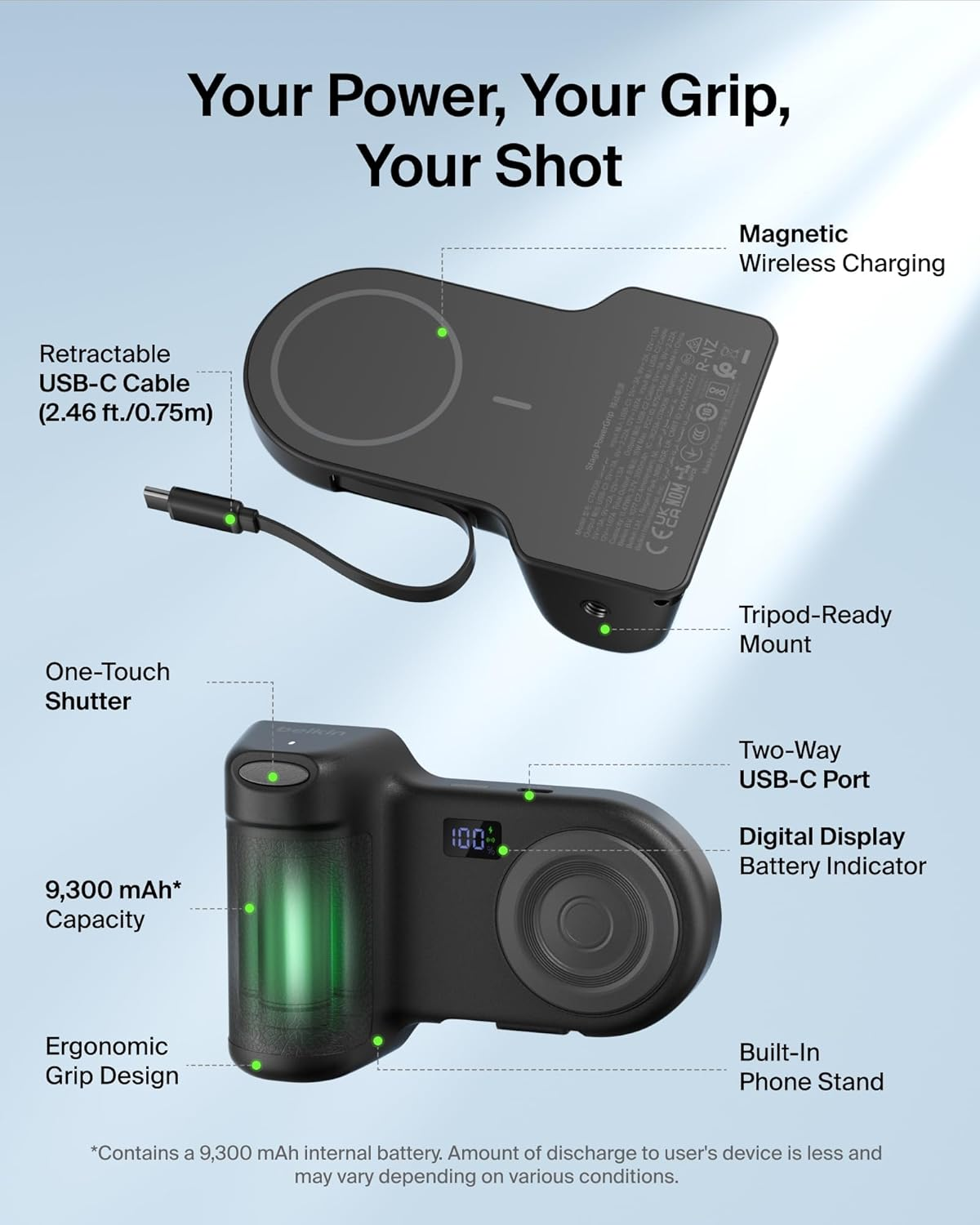 - Belkin’s Stage PowerGrip combines a magnetic camera grip with a 9,300mAh power bank.