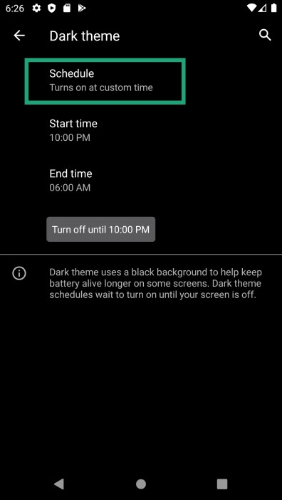 Android 9 brought glimpses of dark mode while Android 10 polished it out. With Android 11, Google is offering a way to schedule the dark theme to turn on and off at certain times during the day.
